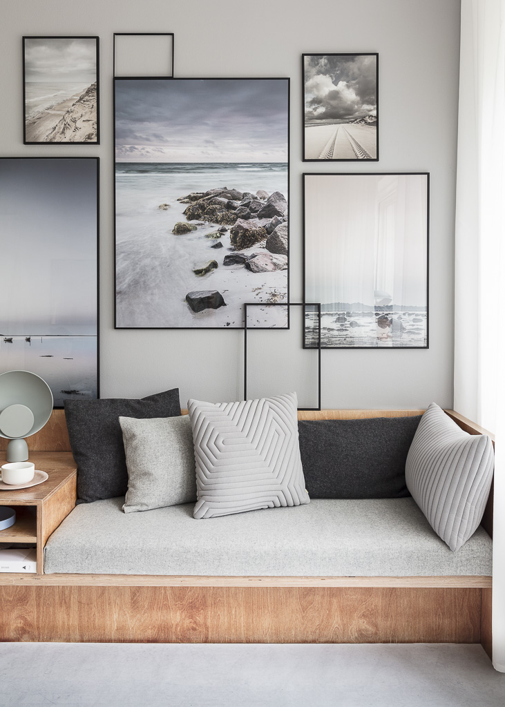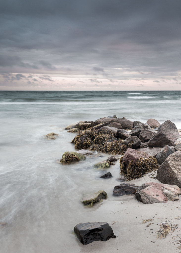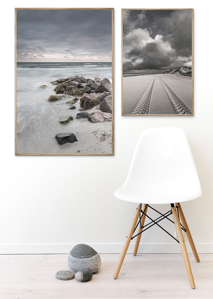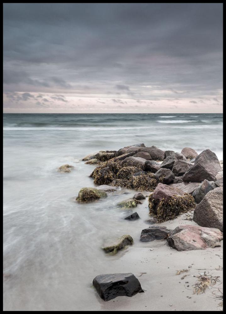 En fin fotoplansch kan göra underverk för din vägg! Här har vi en drömsk bild tagen på danska Glænø, föreställande en kontrastfull horisont och dimliknande vågor som sköljer upp över en vit strand med stora stenar.