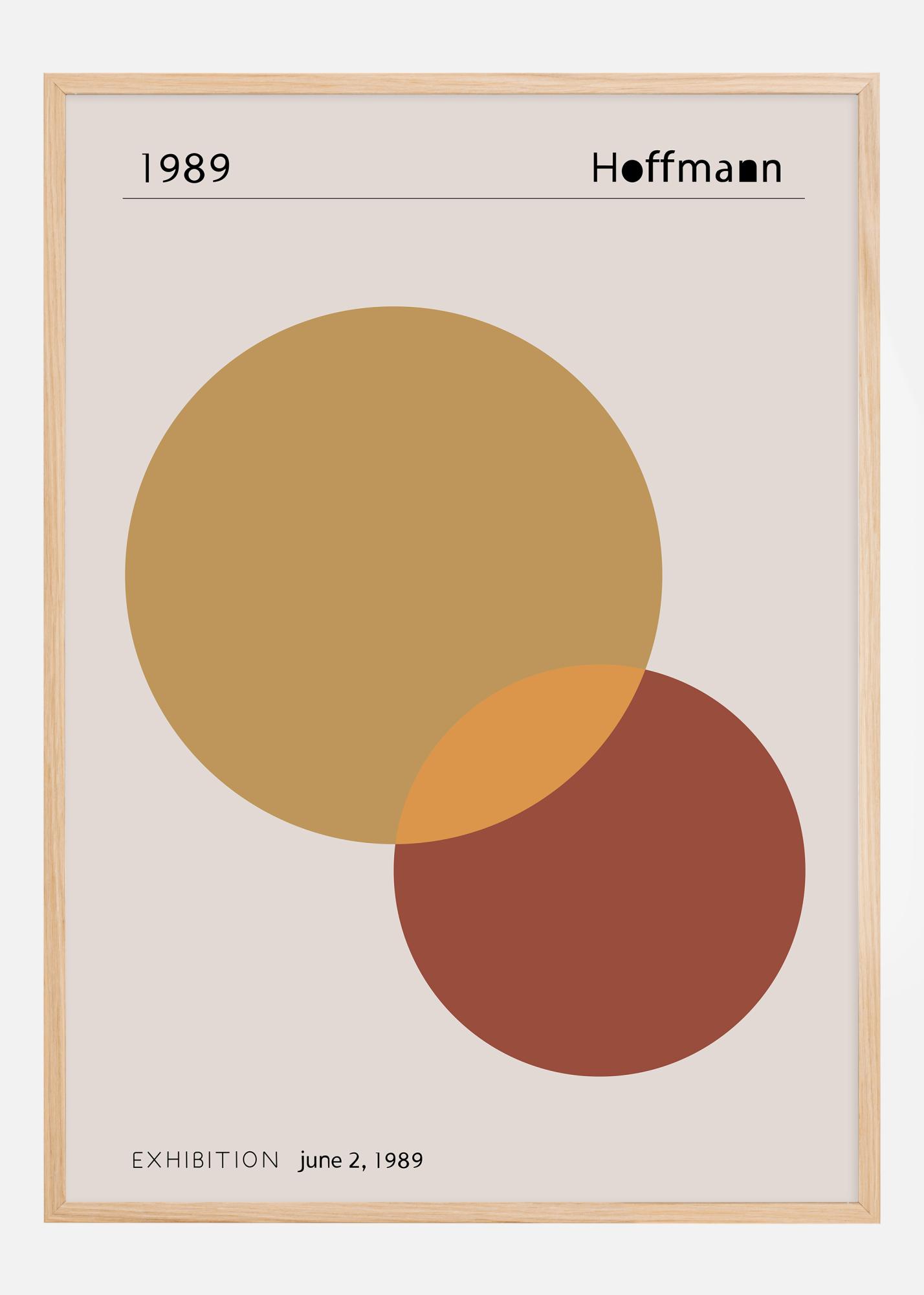 Denna minimalistiska och sofistikerade poster hyllar den abstrakta konstnären Hoffmanns utställning från 1989. Med en stilren design av överlappande cirklar i varma toner av brun och ockra skapar denna affisch en känsla av både retro och modernitet. Texten är diskret placerad för att ge utrymme åt det visuella, där varje element är noggrant balanserat för att skapa ett stämningsfullt och inbjudande konstverk.