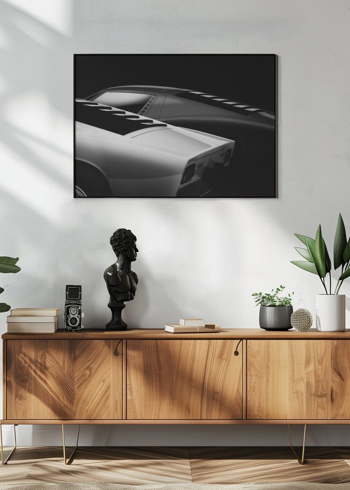 Färgpaletten i detta motiv består av skarpa kontraster mellan djupsvarta nyanser och lysande vita toner, vilket förstärker bilens dynamiska design. Den minimalistiska stilen gör denna print till ett utmärkt val för både moderna och klassiska inredningsstilar. Låt denna affisch bli en central del av din väggkonst och ge ditt hem en känsla av fart och elegans.