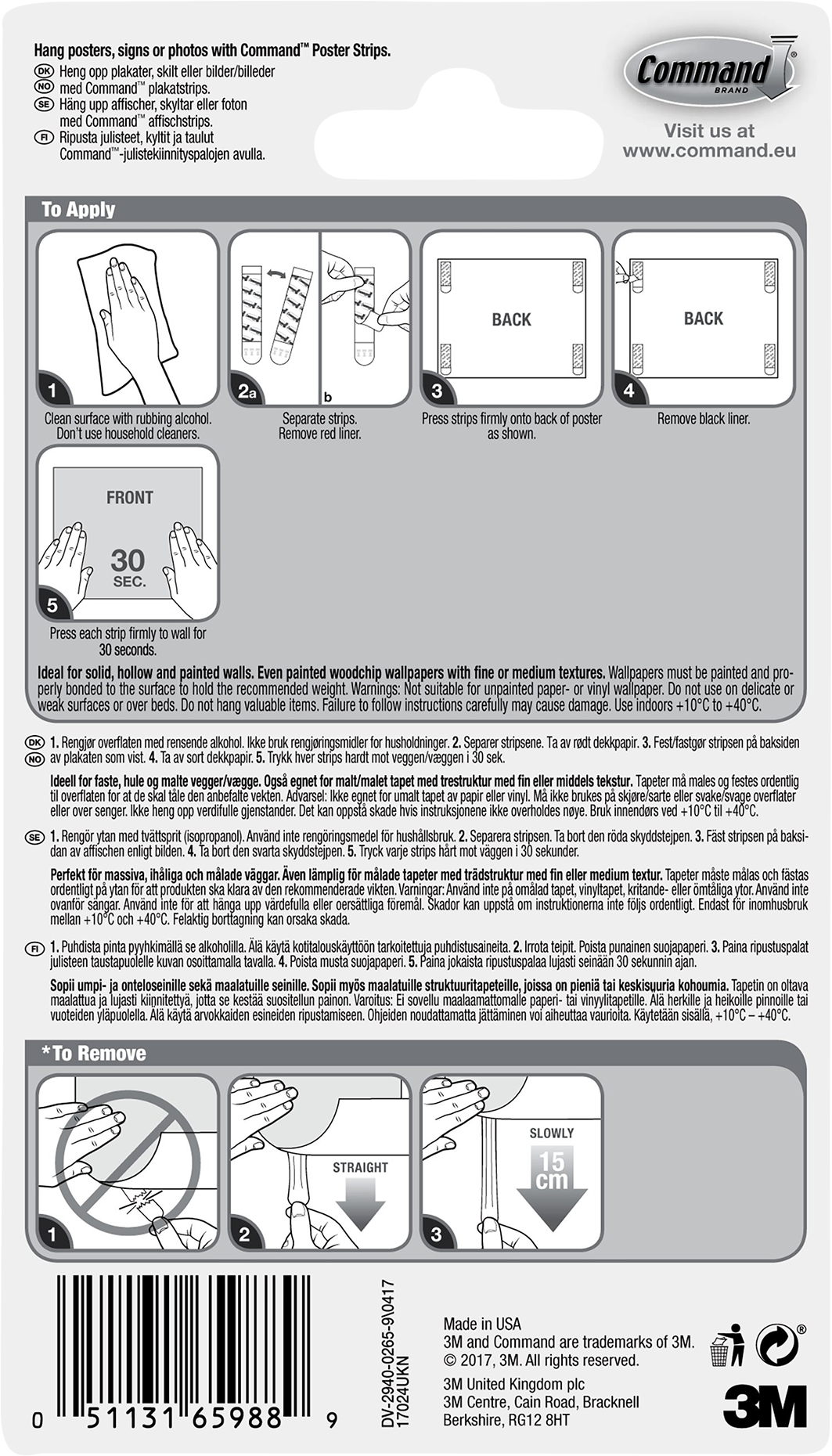 Command Poster Strips är en snabb och smidig lösning för säker upphängning av posters, kalendrar och andra lätta föremål. Upphängningsremsorna fäster enkelt på väggen och kan användas på de flesta släta ytor, exempelvis målade väggar, målad tapet, kakel, metall och trä. De bör inte användas på omålad tapet, vinyltapet eller ömtåliga ytor.