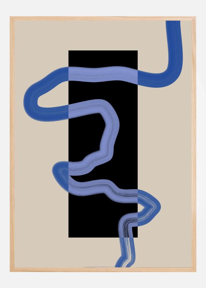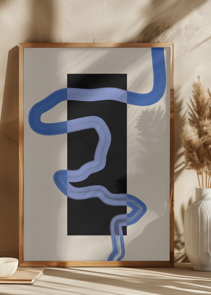 Denna moderna poster fångar ditt öga med sina unika, böljande linjer i dämpade blåa nyanser som flyter över en elegant beige bakgrund. Den svarta rektangeln i mitten ger en djärv kontrast, vilket framhäver de svepande kurvornas rörelse och skapar ett dynamiskt uttryck. Perfekt för den som vill ha en stilren affisch som även ger en konstnärlig känsla åt rummet.