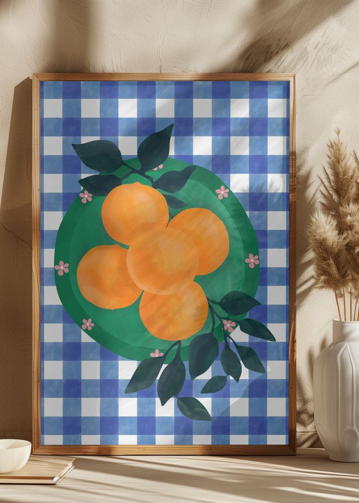 Bakgrunden på postern har ett klassiskt rutmönster i klarblått och vitt, vilket framhäver frukternas varma toner och skapar en dynamisk kontrast. Denna unika kombination av färger gör detta motiv till en iögonfallande och trendig inredningsdetalj för ditt hem.