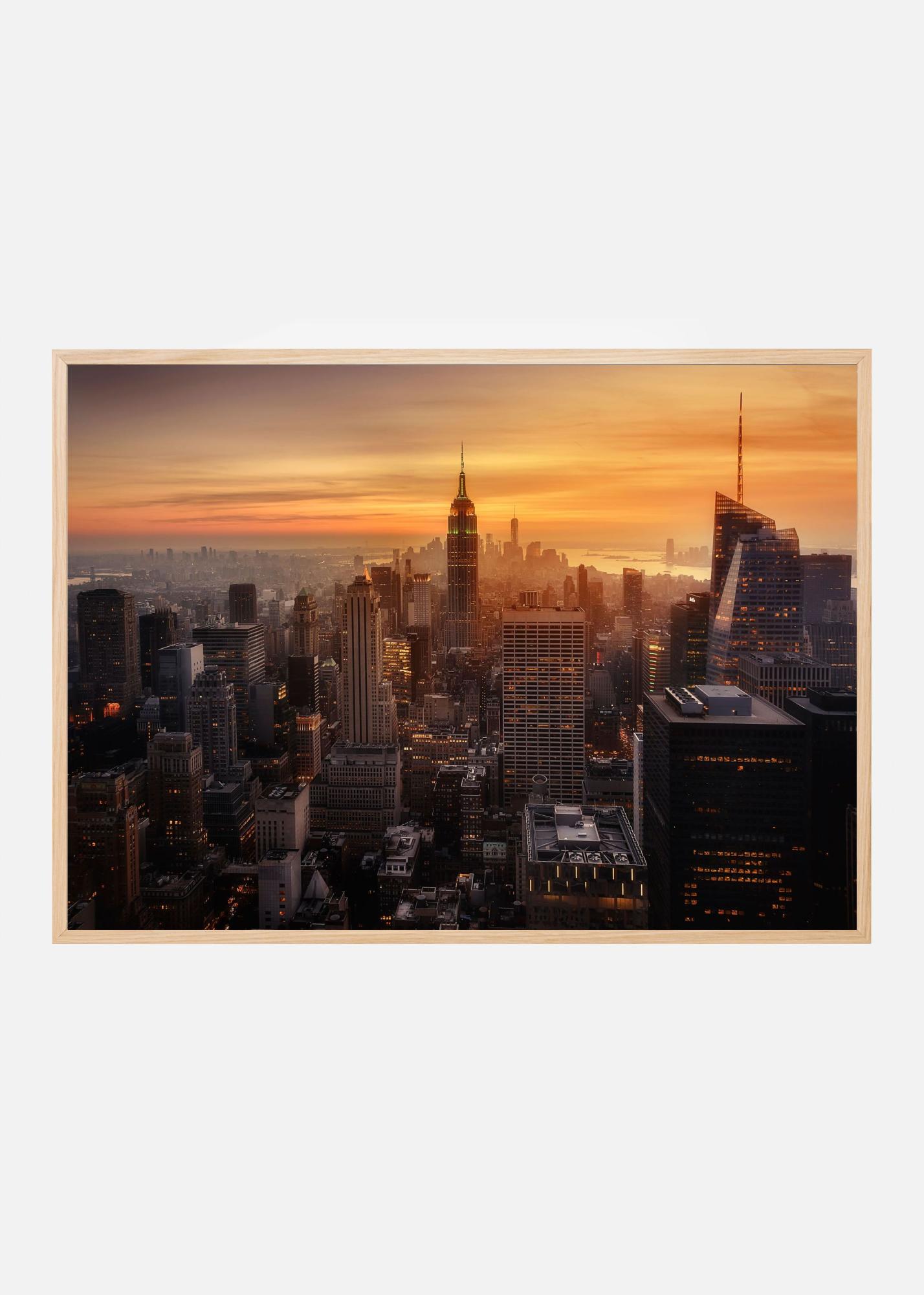 Denna poster fångar den magnifika New York-silhuetten i solnedgångens gyllene timmar. Med Empire State Building i fokus, sträcker sig stadens skyline ut i en imponerande panoramavy. Perfekt för dig som älskar storstadens puls och vill förmedla dess energi hemma. Affischen förmedlar en känsla av drömmar och möjligheter, vilket gör den idealisk för både hem och kontor.
