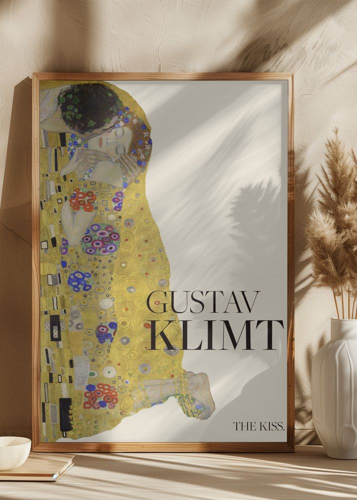 Denna vackra poster, som föreställer "The Kiss" av Gustav Klimt, är ett tidlöst konstverk som fångar intimitet och passion. I detta verk ser vi en sensuell sammansmältning av två figurer omgivna av en praktfull mosaik av mönster och färger. Mönstret innehåller en fantastisk mix av rött, blått, gult, guld, grönt och svart som tillsammans skapar en hypnotiserande visuell upplevelse. Den dova bakgrundsfärgen framhäver de livfulla tonerna i denna print, vilket gör den till en perfekt detalj för ditt hem.