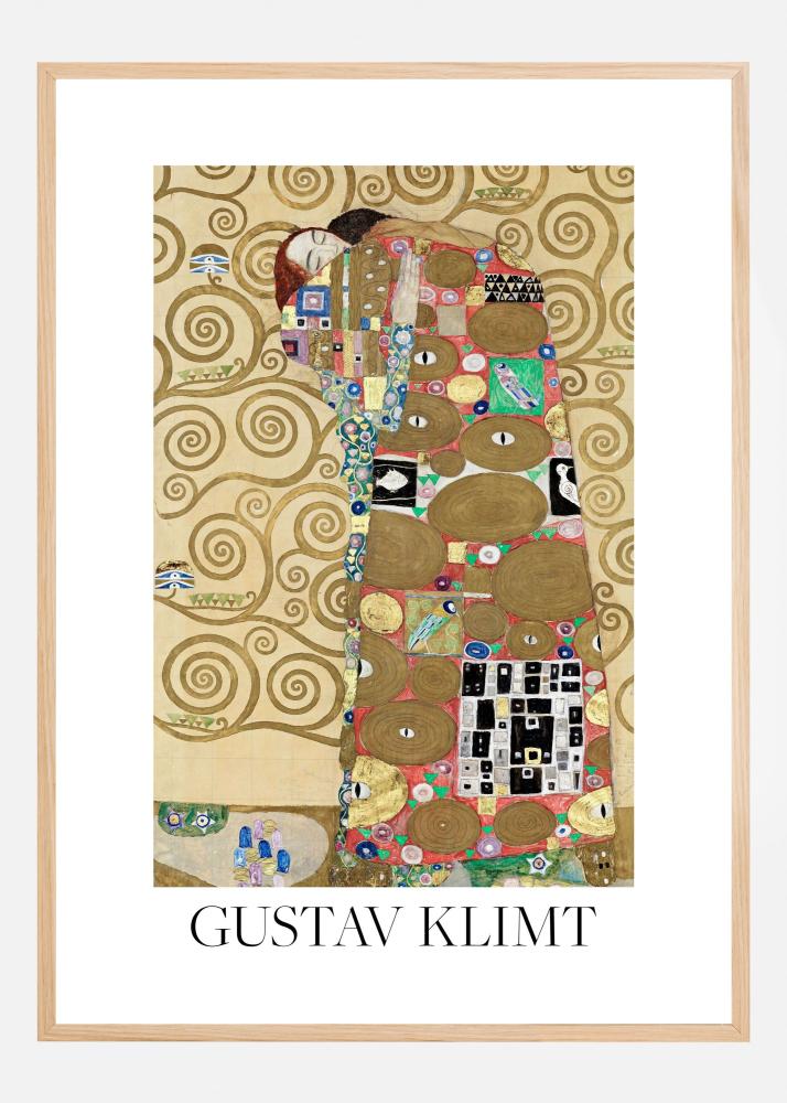 Denna poster avbildar ett av Gustav Klimts mest ikoniska verk, där det romantiska motivet fångar ett intimt ögonblick fullt av symbolik och detaljer. Affischens komposition, präglad av Klimts unika stil, erbjuder en fascinerande blandning av mönster och former som drar blicken till sig och skapar en känsla av djup och rörelse.