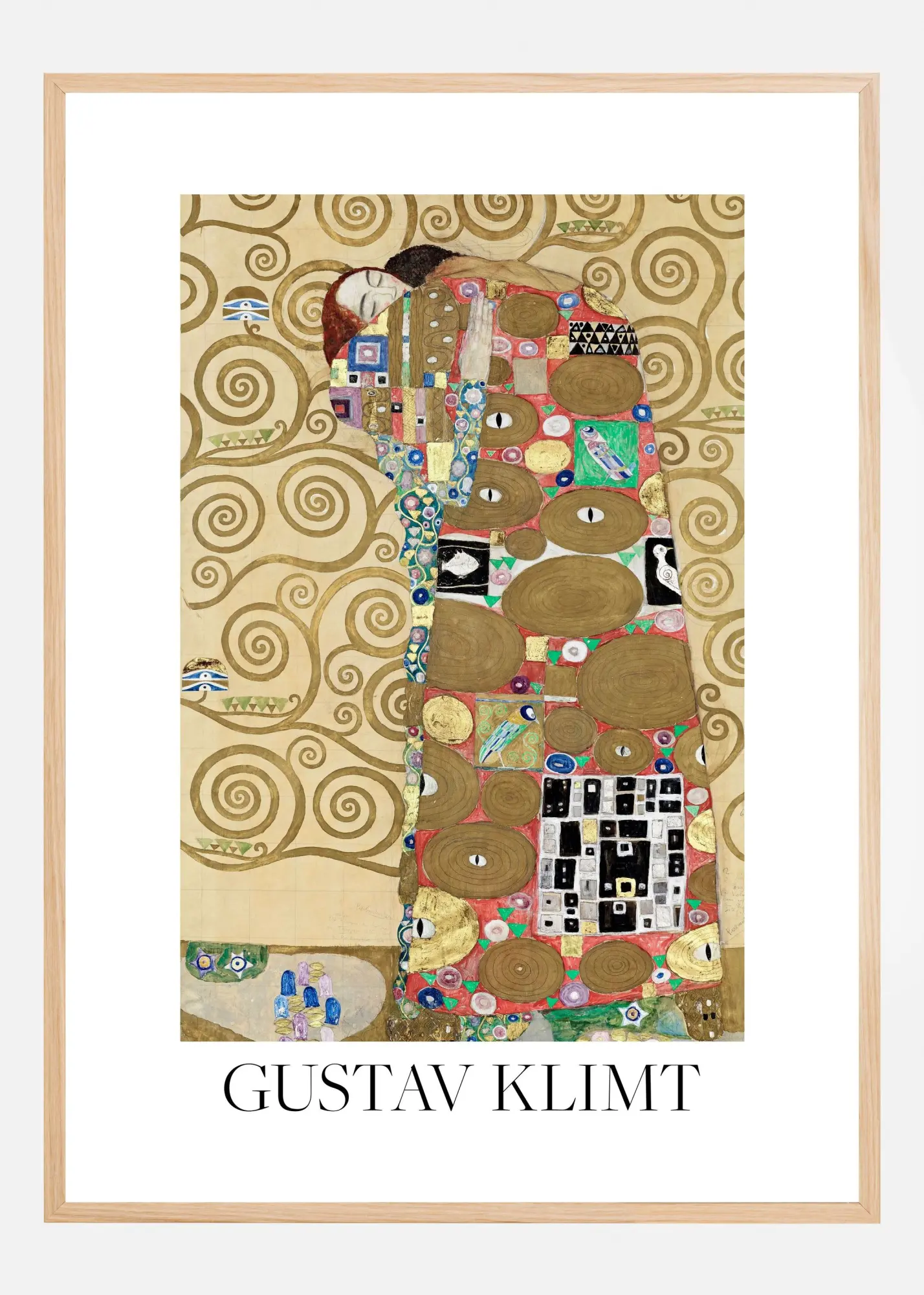 Denna poster avbildar ett av Gustav Klimts mest ikoniska verk, där det romantiska motivet fångar ett intimt ögonblick fullt av symbolik och detaljer. Affischens komposition, präglad av Klimts unika stil, erbjuder en fascinerande blandning av mönster och former som drar blicken till sig och skapar en känsla av djup och rörelse.
