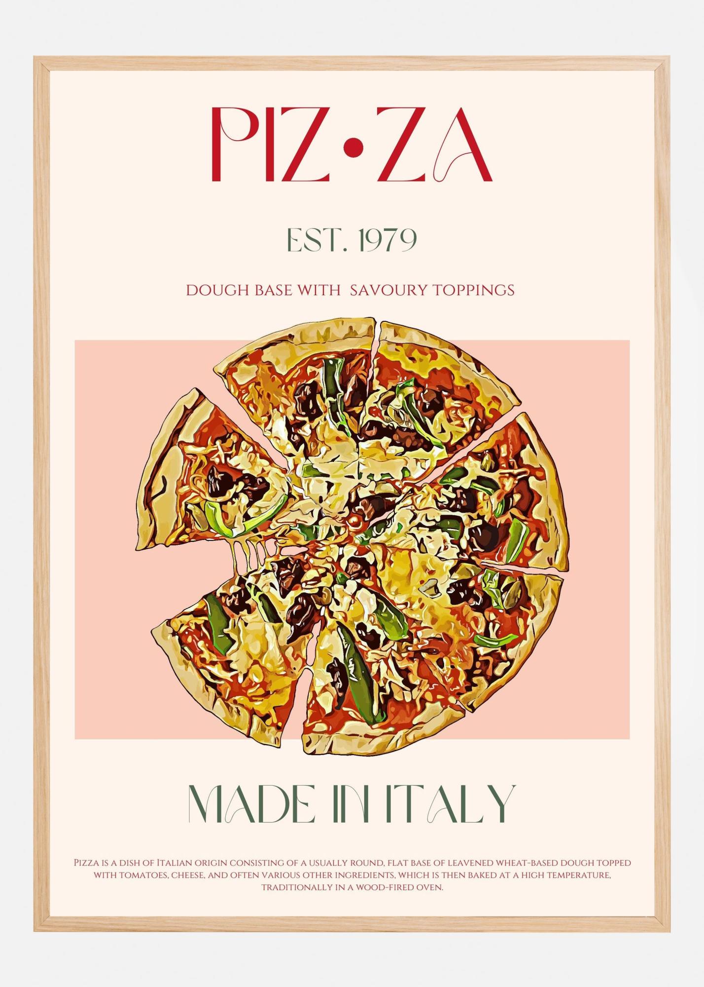 Denna poster fångar essensen av italiensk matkultur med ett elegant och färgglatt motiv av pizza. Det centrala motivet visar en aptitretande pizza med olika smakrika toppings, vilket ger en känsla av tradition och autenticitet. Texten "PIZZA" och "Made in Italy" förstärker temat och ger affischen en touch av nostalgi och stil.