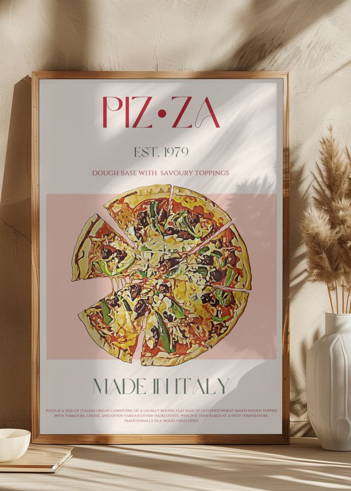 Denna poster fångar essensen av italiensk matkultur med ett elegant och färgglatt motiv av pizza. Det centrala motivet visar en aptitretande pizza med olika smakrika toppings, vilket ger en känsla av tradition och autenticitet. Texten "PIZZA" och "Made in Italy" förstärker temat och ger affischen en touch av nostalgi och stil.