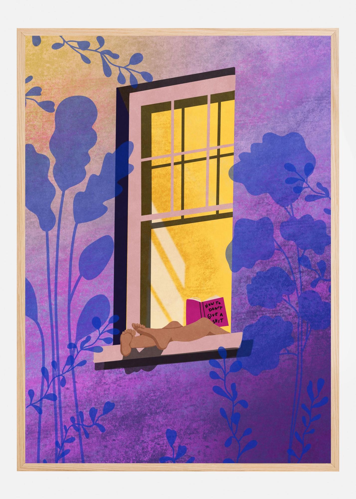 Denna poster fångar en avkopplande stämning med en person som vilar handen på ett fönsterbräde, i en solstråle. Bakom fönstret strömmar ljuset in och skapar en varm atmosfär. Designen ger en känsla av lugn och stillhet, perfekt för att dekorera ditt hem eller kontor och ge det en modern touch.