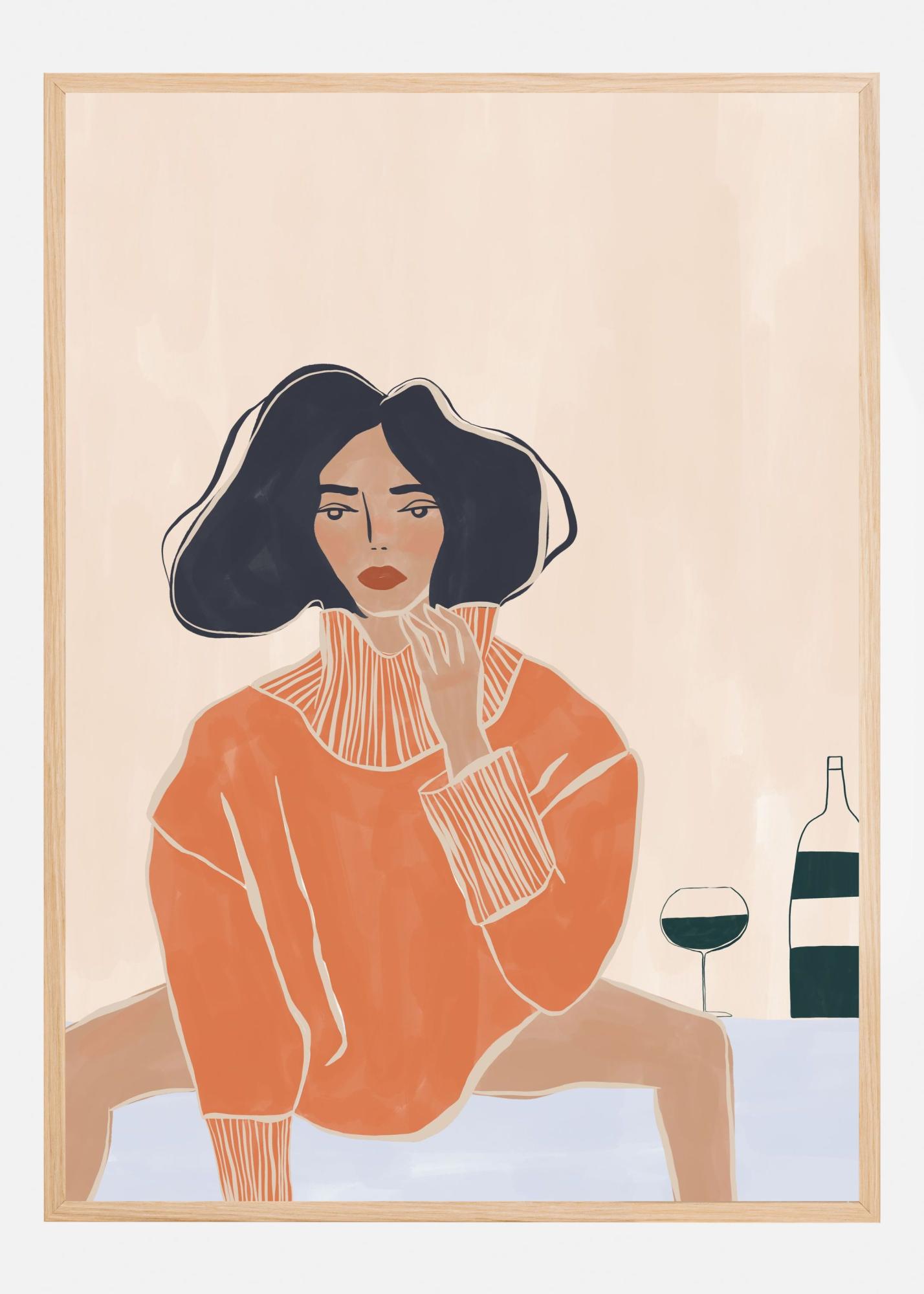 Denna stilrena poster föreställer en elegant kvinna med ett uttrycksfullt ansikte, stylad i en voluminös mörk frisyr. Hon klär sig i en mjukt strukturerad tröja i en varm, dämpad orange nyans som ger en känsla av komfort och modernitet. Hennes klädsel matchar harmoniskt den diskreta bakgrunden som har en krämig, ljus beige ton, vilket framhäver hennes närvaro på ett sofistikerat sätt.
