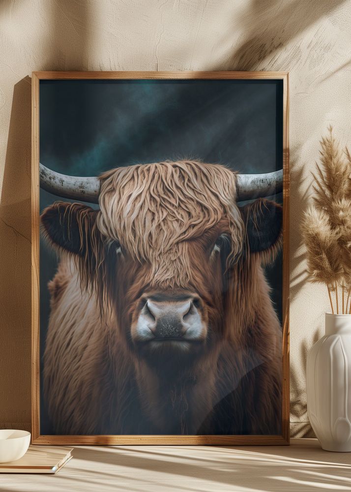 Färgskalan i motivet består av varma bruna nyanser från tjurens päls kombinerat med den djupa svärtan i bakgrunden. Ljusa toner syns i hornens vita och grå partier, vilket skapar en fin kontrast mot de mörkare områdena. Denna affisch är perfekt för dem som vill tillföra en rustik och samtidigt elegant atmosfär till sitt hem.