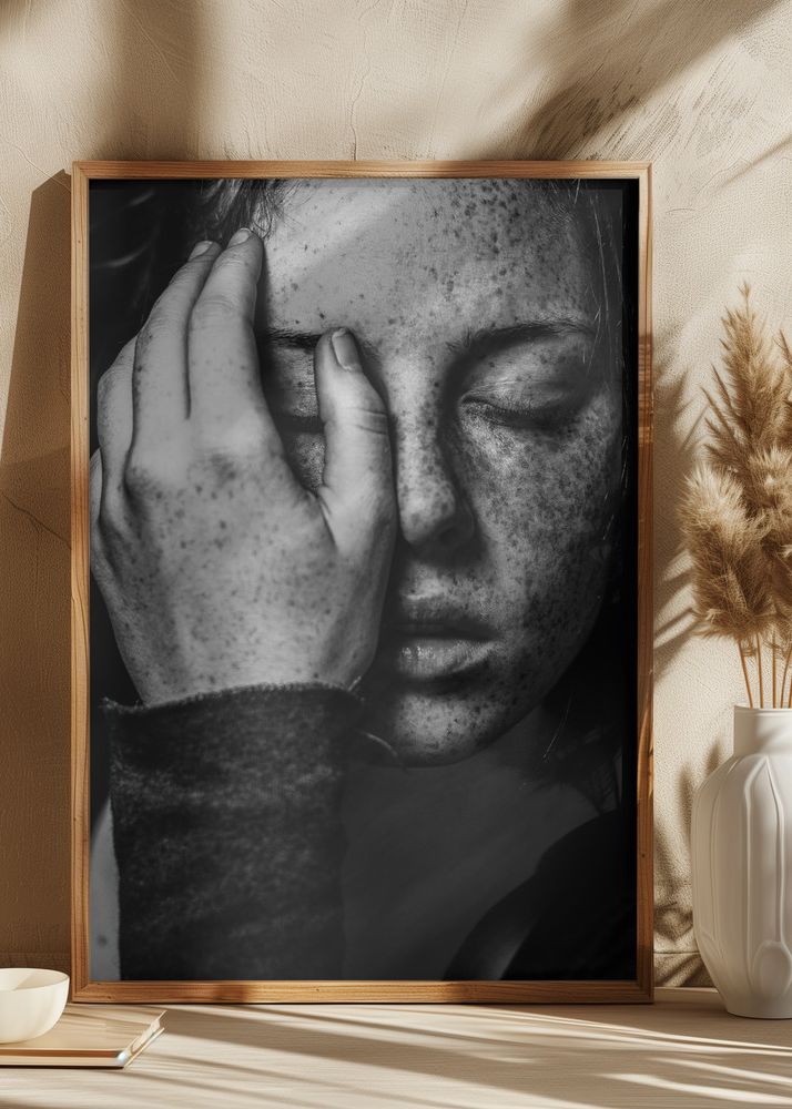 Denna poster fångar ett intensivt och känslosamt ögonblick i ett svartvitt fotografi av ett ansikte. Det svartvita temat ger en tidlös och stilren känsla som gör att affischen passar i olika inredningsstilar. Kontrasterna mellan de olika gråskalorna i bilden framhäver detaljerna och ger en djup och poetisk effekt.
