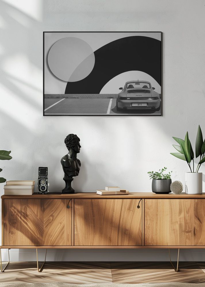Denna stilrena poster fångar essensen av modern design med en svartvit estetik som passar in i olika miljöer. Motivet visar en elegant bil parkerad framför en vägg med geometriska former, vilket skapar en känsla av rörelse och stil. Den minimalistiska designen gör denna print till ett perfekt val för den som älskar samtida konst och design.