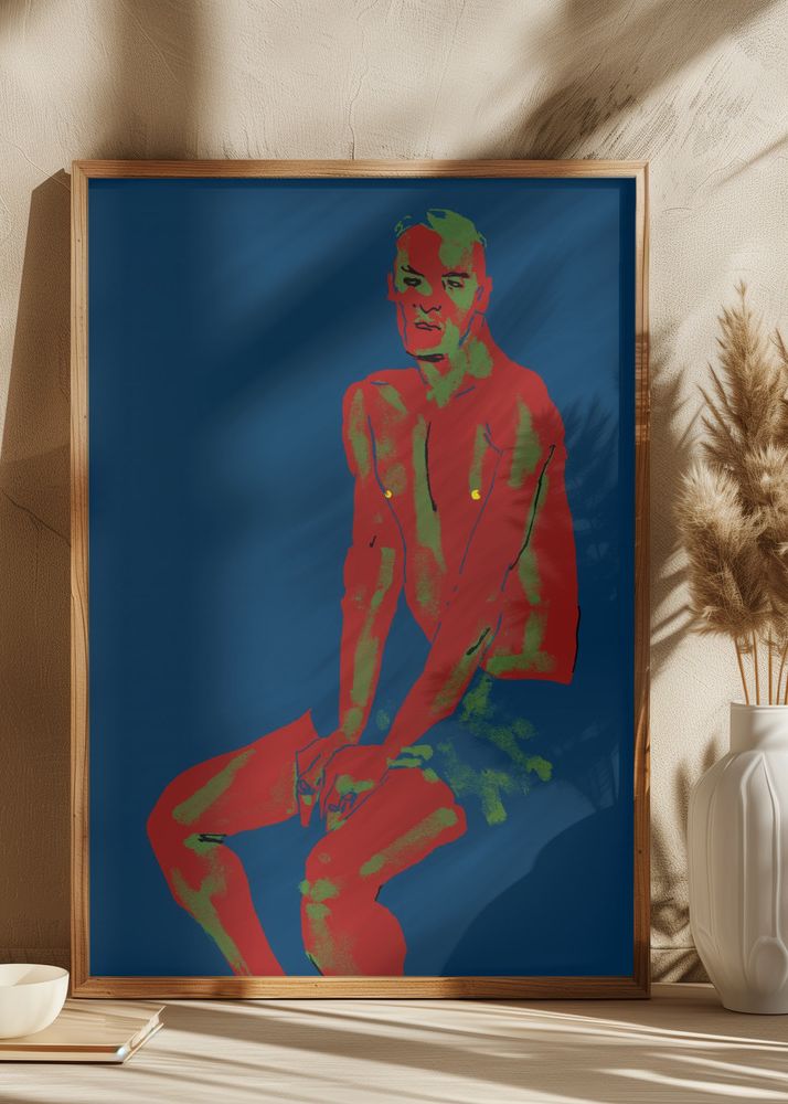 Denna eleganta poster fångar essensen av modern konst med sin djärva användning av färger. Motivet visar en naken figur i en sittande position, vilket ger en känsla av djup och kontemplation. Den intensiva röda färgen på kroppen kontrasterar vackert mot den djupt blå bakgrunden, vilket skapar en visuell balans som drar in betraktarens öga. Dess minimalistiska stil gör att denna affisch enkelt kan passa in i olika inredningsstilar, från det moderna till det klassiska.