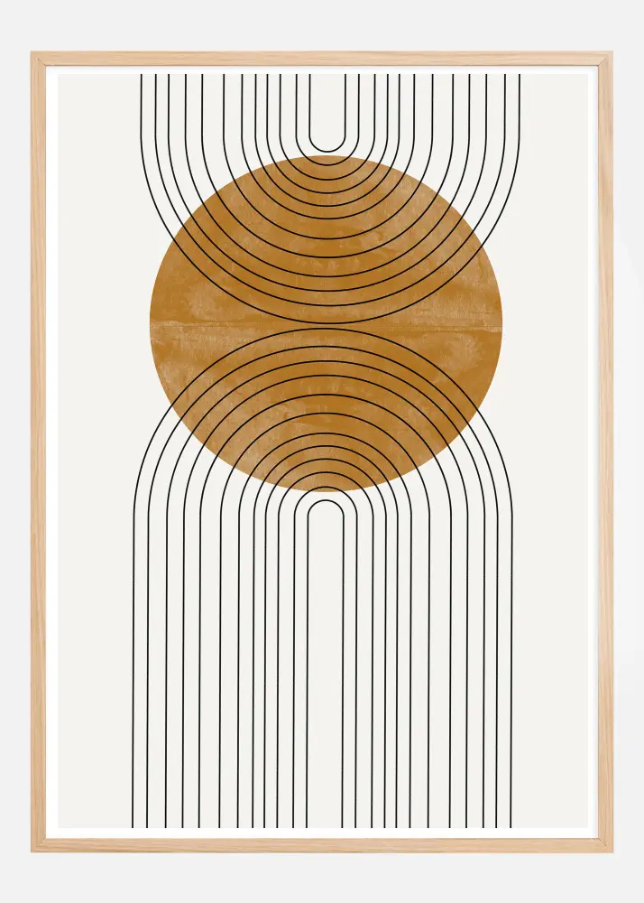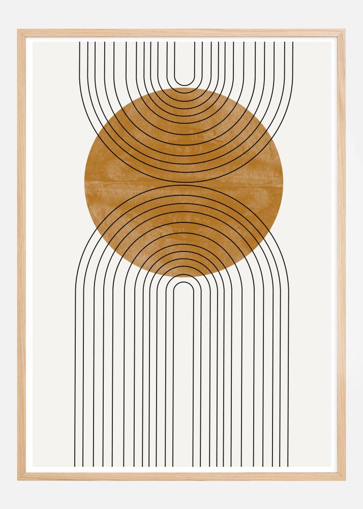 Denna postern fångar en enastående blandning av geometri och natur med sina svepande linjer som formar två överlappande halvcirklar. Den ovanliga designen skapar en känsla av rörelse och balans, medan de varma brunaktiga tonerna ger en känsla av jordnära stabilitet. Dess rena och flytande linjer i svart kontrasterar vackert mot den ljusa bakgrunden och den mättade brunaktiga färgen, och skapar en bild som är både modern och tidlös.