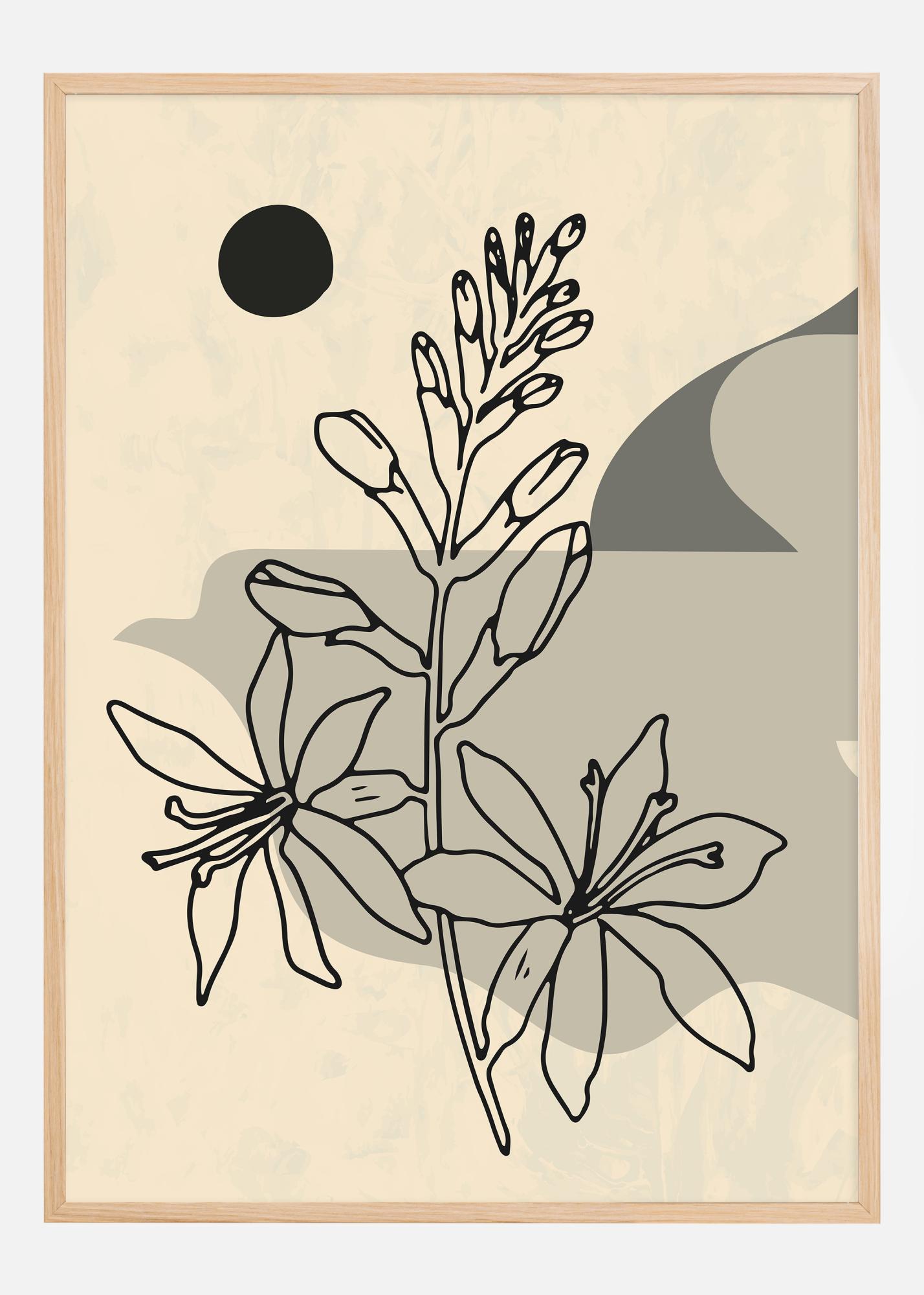 Denna estetiskt tilltalande poster fångar en abstrakt tolkning av blommor i blom, där grafiska linjer möter organiska former. Verket spelar på en neutral bakgrund i beige, kompletterat av en mörk, cirkulär form som ger kontrast och djup. I förgrunden sträcker sig stiliserade blommor och knoppar uppåt i silhuett, skapade med skarpa svarta konturer som ger en stark visuell effekt.