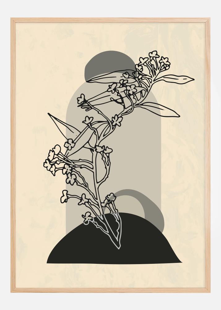 Denna sofistikerade poster framställer en abstrakt blomställning som kombinerar naturliga former med grafiska element för en samtida känsla. Motivet använder sig av en subtil färgskala med mjuka beige toner och djärva svarta linjer, vilket ger en kontrast som är både iögonfallande och elegant. Designen lägger stor vikt vid komposition och balans, och placerar de organiska formerna av blommor och blad över en solid svart halvcirkel, som skapar en illusion av skugga och djup.