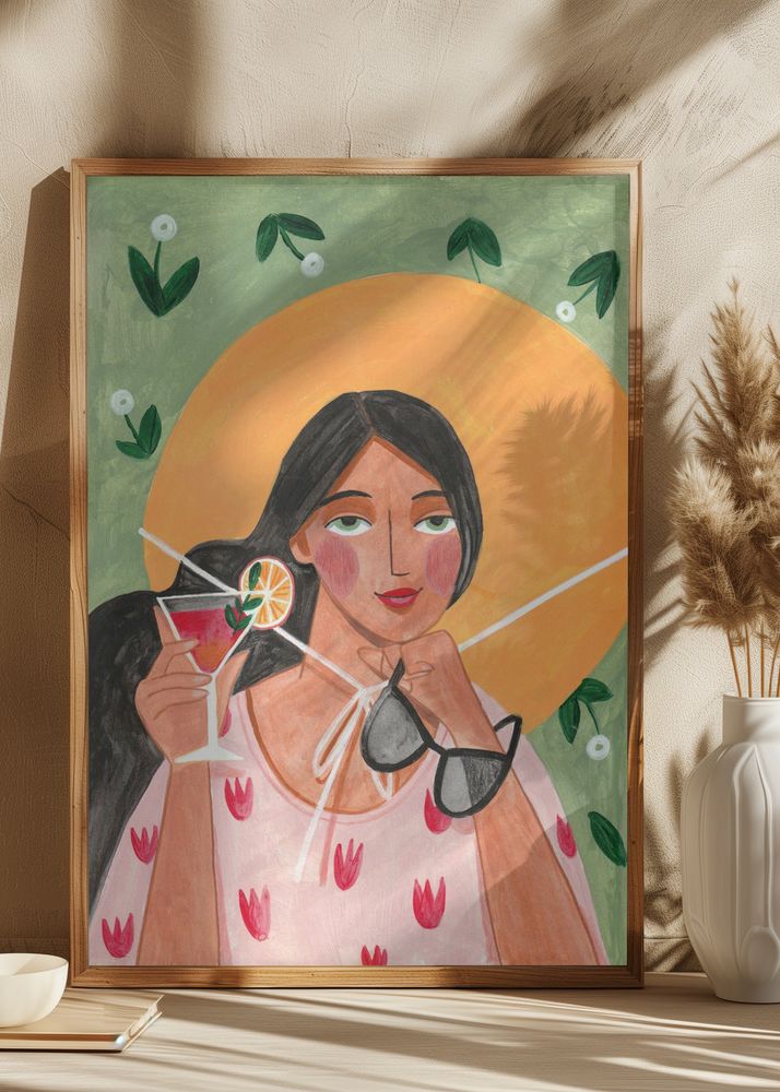 Upptäck en färgglad och livfull poster som fångar sommarens essens. Motivet visar en stilfull kvinna med långt mörkt hår, klädd i en trendig blus med röda tulpanmönster. Hon håller en cocktail i handen, dekorerad med citrusfrukter, vilket tillför en exotisk känsla till printet. Kvinnans uttryck är avslappnat och självsäkert, vilket gör denna affisch perfekt för den som vill addera en touch av elegans och njutning till sitt hem.