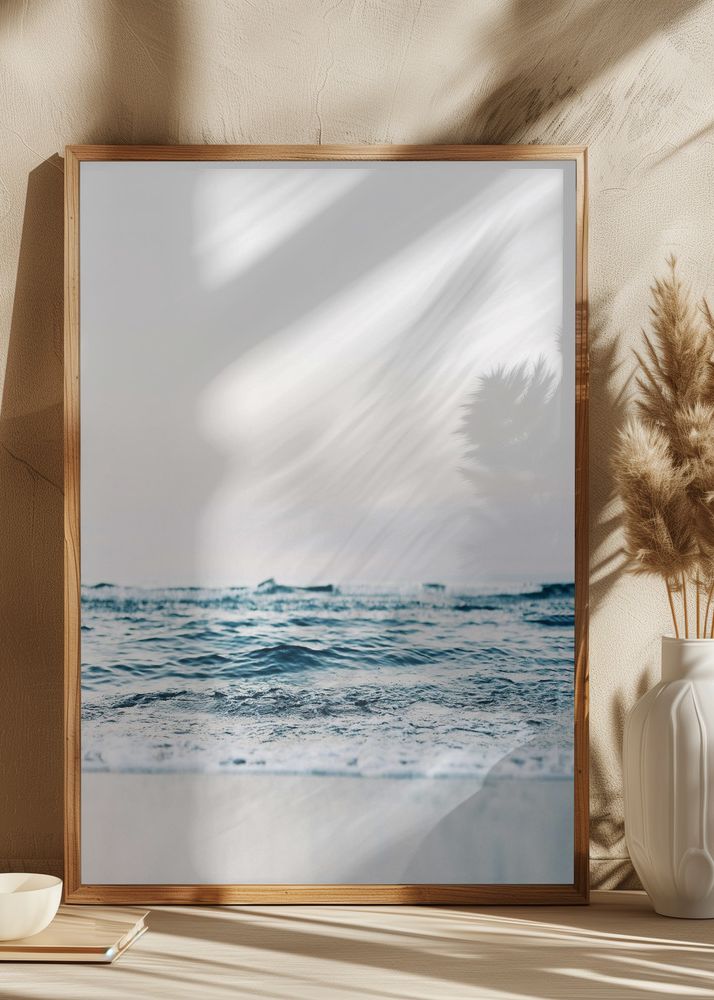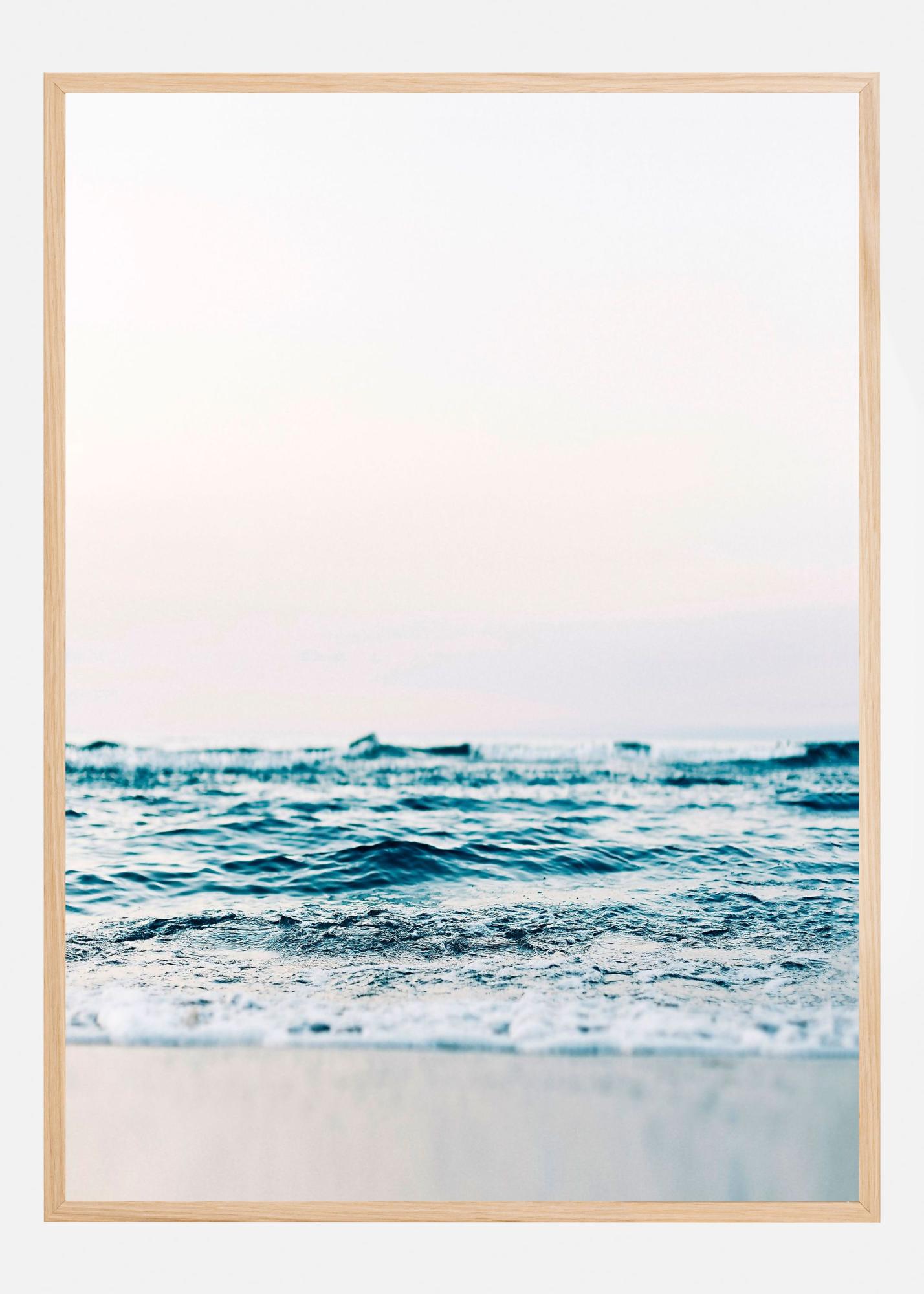 Denna stilrena affisch fångar den stilla och fridfulla essensen av havets skönhet. Med sina mjukt böljande vågor i förgrunden, förmedlar postern en känsla av ro och lugn. Perfekt för dig som vill tillföra en touch av natur och avkoppling till din inredning. Bildens komposition drar blicken mot horisonten och uppmanar till dagdrömmande stunder.