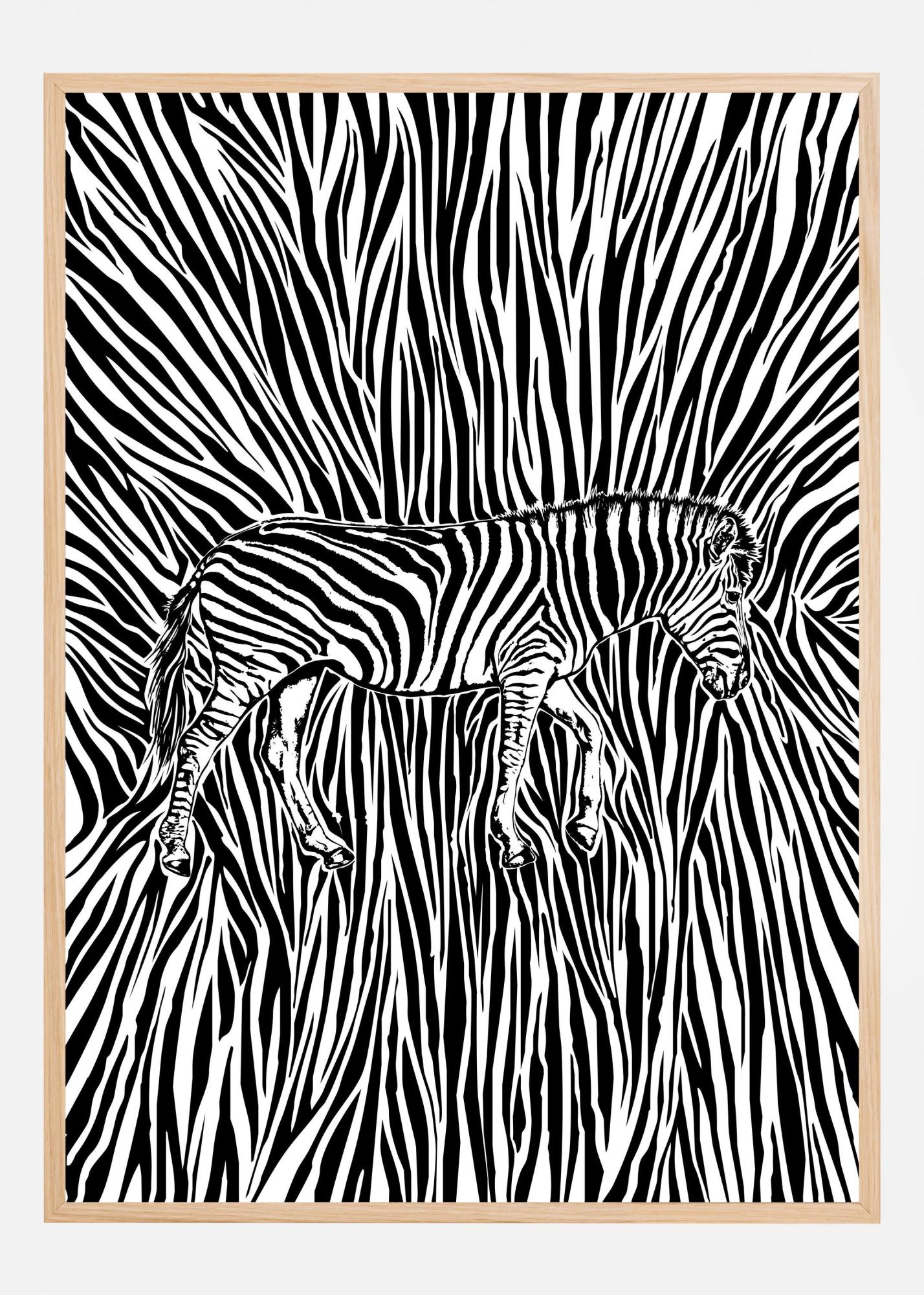 Denna poster fångar det fascinerande mönstret av en zebra i vacker symbios med sin omgivning. Zebrans karakteristiska svarta och vita ränder smälter harmoniskt samman med bakgrunden och skapar en illusion av rörelse och djup, perfekt för att ge liv och energi åt vilket rum som helst. Perfekt för dem som uppskattar djurmotiv och unik konst.