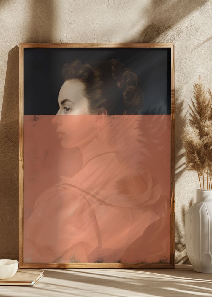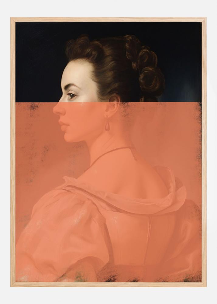 Denna eleganta poster föreställer en klassiskt inspirerad porträttmålning av en kvinna, vars ansikte är delvis täckt av en modern orange abstraktion. Detta unika motiv kombinerar tradition och samtida design, vilket skapar en spännande kontrast som passar perfekt i ett modernt hem.