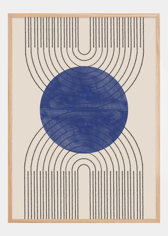 Skapa en lugn och samlad atmosfär i ditt rum med vår abstrakta poster som blandar mjuka linjer och djärva färger. Den stora blå cirkeln i mitten ger en påtaglig känsla av stillhet och är som en portal till en annan värld, inramad av en serie av koncentriska bågar som skapar en arkitektonisk känsla. Detta konstverk blandar tradition med modernitet och ger en fridfull balans till din omgivning.