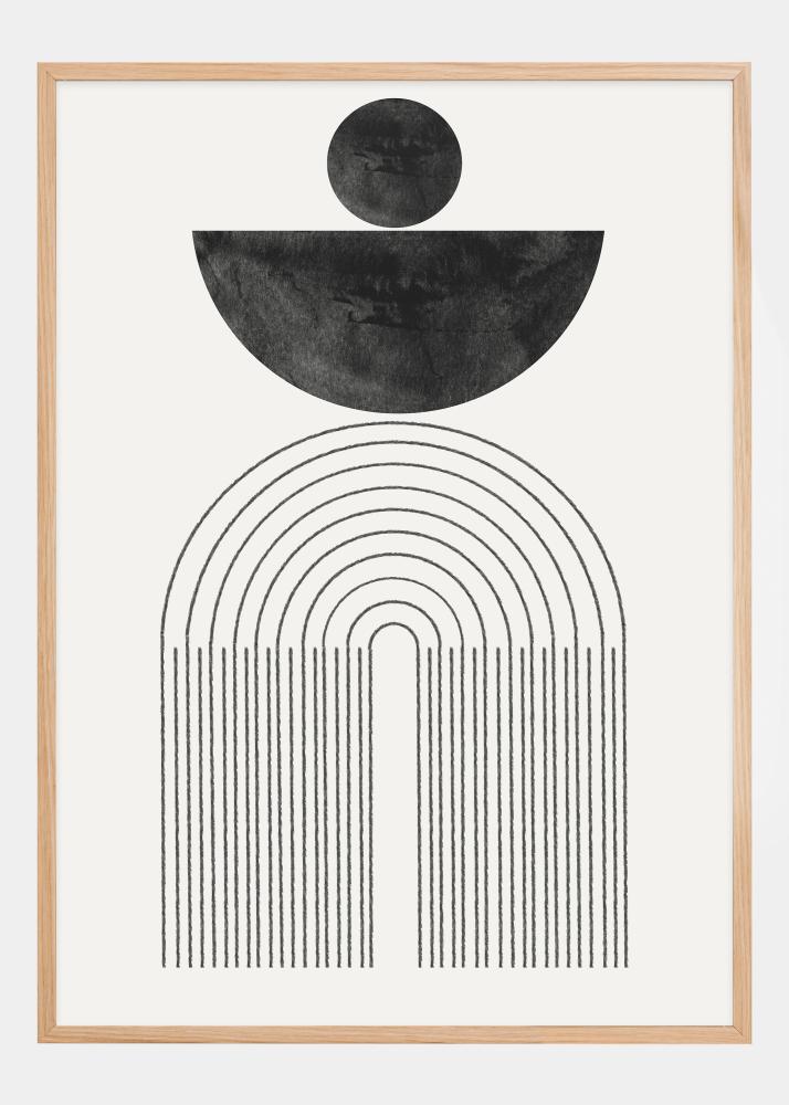 Denna djärva och suggestiva poster är en stilren tolkning av månens cykler och himlakropparnas harmoni. Den svarta halvcirkeln och den fulla cirkeln ovanför illustrerar månens olika faser, medan de svepande linjerna nedanför liknar arkitektoniska pelare eller portaler till en annan dimension. Konstverkets svartvita kontrast ger en känsla av elegans och mystik som berikar varje rum.