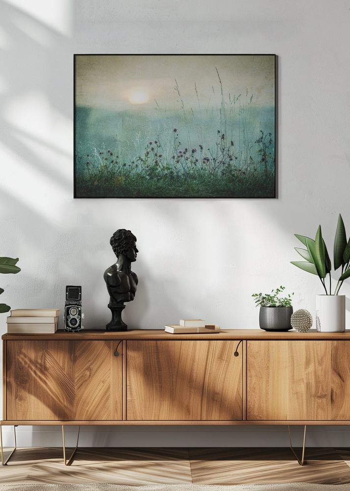 Denna vackra poster fångar en lugn och dimmig landskapsscen med högresta grässtrån och blommor i förgrunden. Bilden ger en drömlik känsla med sin mjuka och naturinspirerade design, vilket gör den till ett perfekt komplement för ett lugnt och avkopplande rum. De subtila detaljerna i detta print lyfter fram naturens enkelhet och skönhet.