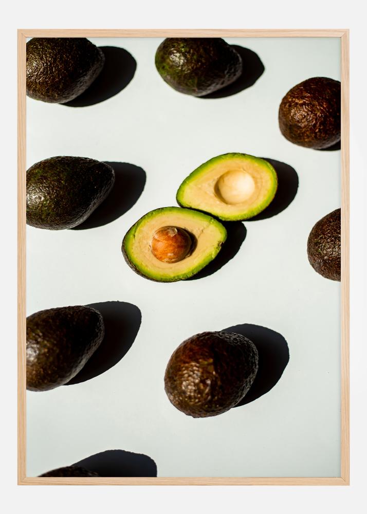 Den här postern hyllar den enkla skönheten hos avokado, en frukt som blivit en ikon för hälsosam mat och moderna kökstrender. De mörkgröna, knotiga skalen av hela avokadon kontrasterar med den ena halvan som är öppen och avslöjar den lena, ljusgröna insidan och den blanka, brunaktiga kärnan. Detta spel mellan textur och färg ger en lekfull och samtidigt stilren estetik.