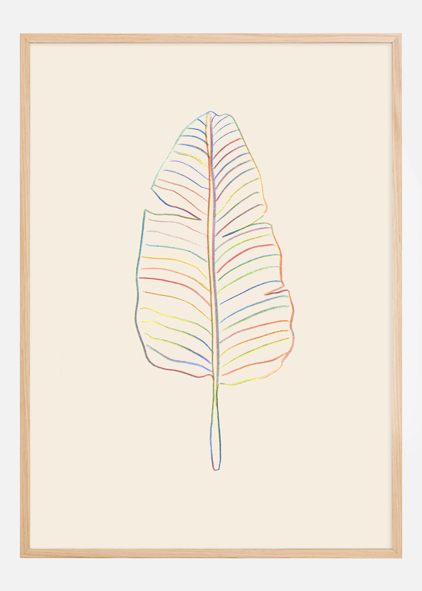 Denna livfulla och färgglada poster framställer en kreativ tolkning av ett bananblad med linjer i ett spektrum av regnbågens färger. Den lekfulla kontrasten mellan bladets naturliga former och de lekfulla färgerna ger en modern twist på klassisk botanisk konst. Den här printen är en utmärkt representation av hur klassiska motiv kan omvandlas med en pop av färg för att passa en modern estetik.