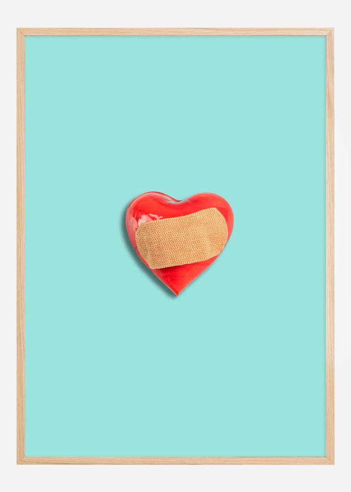 Denna tankeväckande poster visar ett rött hjärta med ett plåster på, mot en lugnande turkos bakgrund. Symboliken är stark och öppen för tolkning, antingen det gäller att läka ett krossat hjärta eller att ta hand om våra känslomässiga sår. Den levande kontrasten mellan det röda hjärtat och den lugnande bakgrunden ger bilden en djup och emotionell resonans.