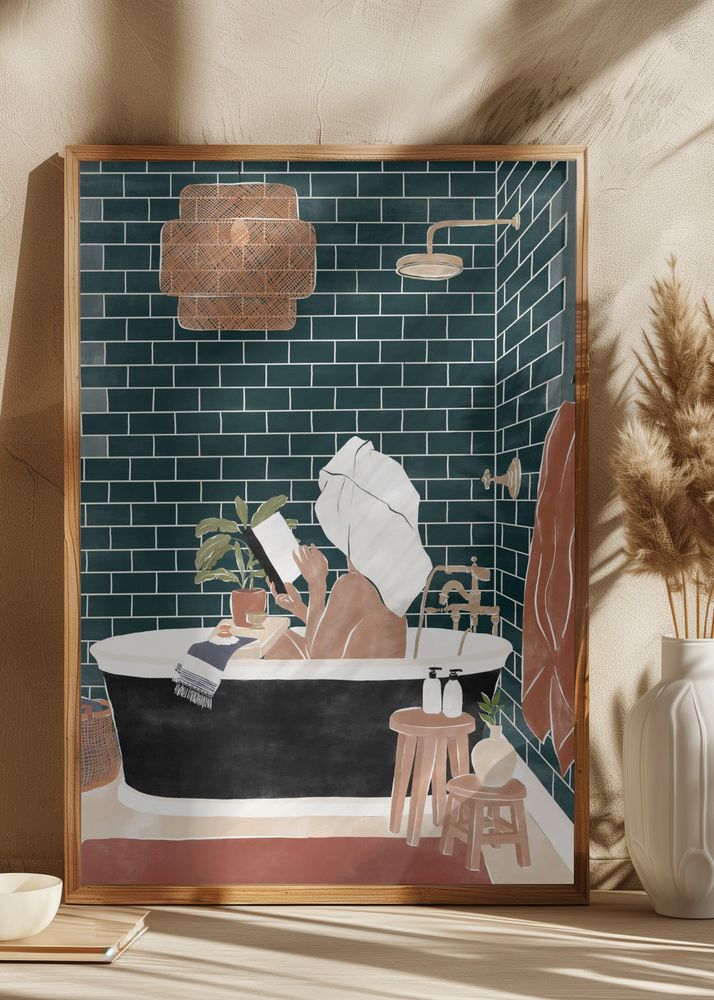 Denna stilrena poster föreställer en avkopplande scen i ett modernt badrum. I motivet syns en person som njuter av ett bad och läser en bok, omgiven av gröna tegelväggar. Inredningen har en harmonisk kombination av jordnära färger som matchar det svarta badkaret och det varma träet i badrumstillbehören. Denna print är perfekt för att skapa en känsla av lugn och elegans i ditt hem.