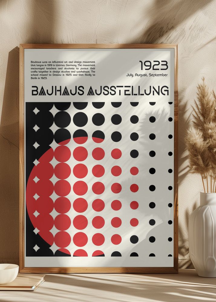 Denna affisch är en hyllning till den ikoniska Bauhausrörelsen, som revolutionerade design och konst under 1900-talet. Motivet präglas av geometriska former och ett modernt, stilrent utseende som fångar andan av innovation och kreativitet. Perfekt som poster för att ge ditt hem eller kontor en känsla av historiskt designarv. Mönstret är dynamiskt och utstrålar en balans mellan form och funktion, vilket gör det till ett uppskattat tillskott i alla inredningsmiljöer.