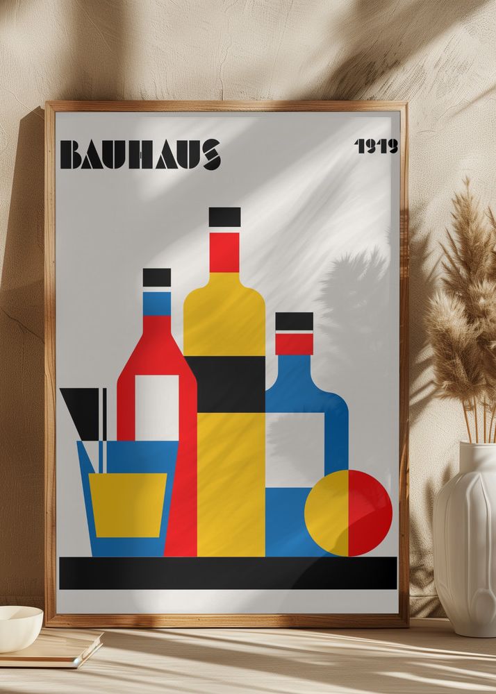 Denna poster fångar essensen av Bauhaus-rörelsens strikta geometri och levande estetik. Med en stilren komposition präglas bilden av tre flaskor, ett glas och en boll, arrangerade för att skapa en visuellt intressant balans. Genom att använda enkla former och linjer skapar denna affisch en harmonisk och modern känsla som passar perfekt i både klassiska och moderna inredningar.