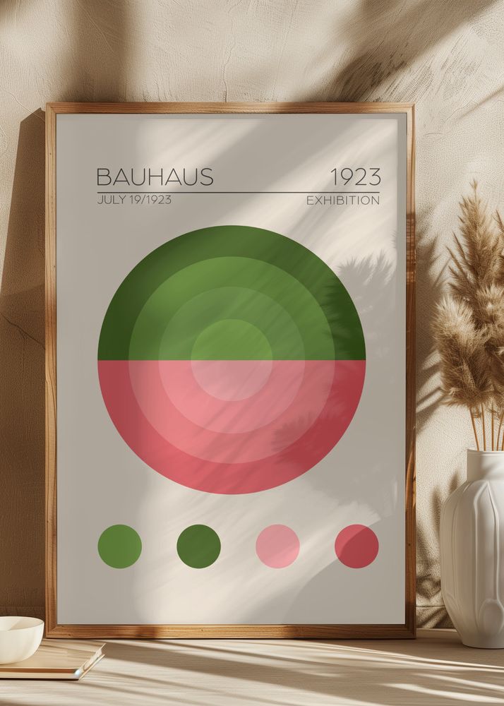 Nedanför huvudmotivet finns fyra mindre cirklar som speglar färgskalan i den stora cirkeln: två gröna och två rosa nyanser. Detta print fångar essensen av 1923 Bauhaus-utställningen med sin tidlösa geometriska design och subtila färgspel. Perfekt som ett unikt dekorativt inslag i ditt hem, denna affisch är idealisk för att sätta en modern prägel på vilken vägg som helst.