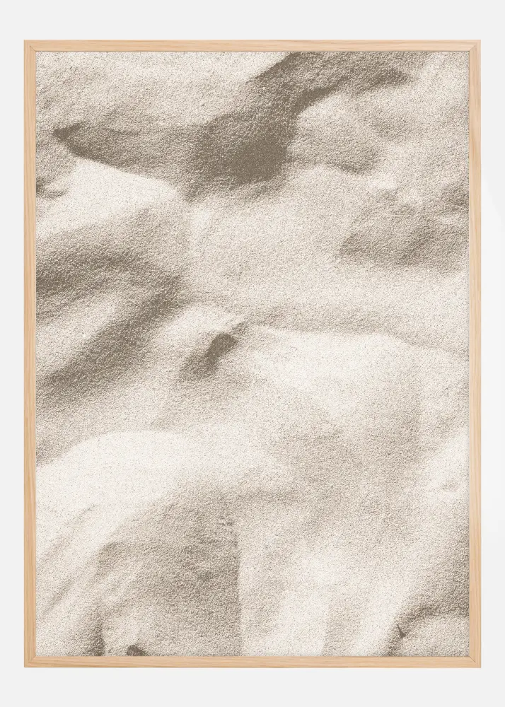 Denna avskalade och meditativa poster fångar den naturliga texturen och de mjuka konturerna av sanddyner. Det monokroma fotot spelar på ljus och skugga för att framhäva de sinnliga och flyktiga formerna som skapas av vindens rörelser över sandens yta. De mjuka graderingarna från ljus till mörker skapar en nästan hypnotisk effekt, vilket inbjuder till reflektion och stillhet.