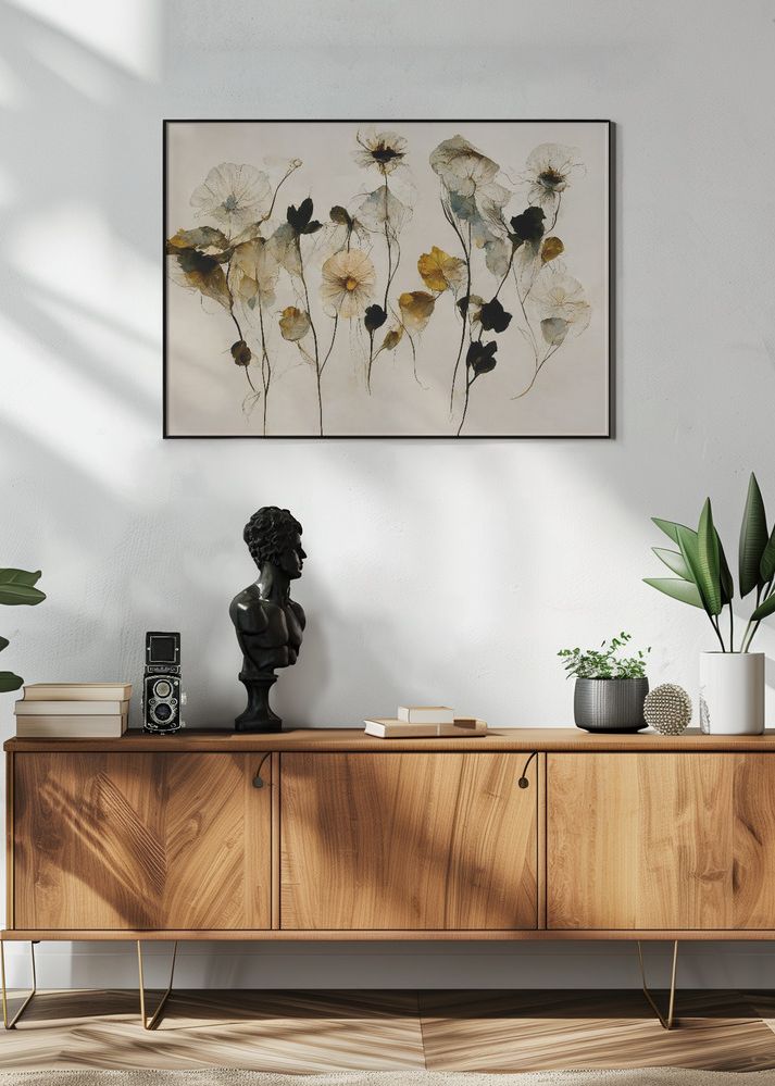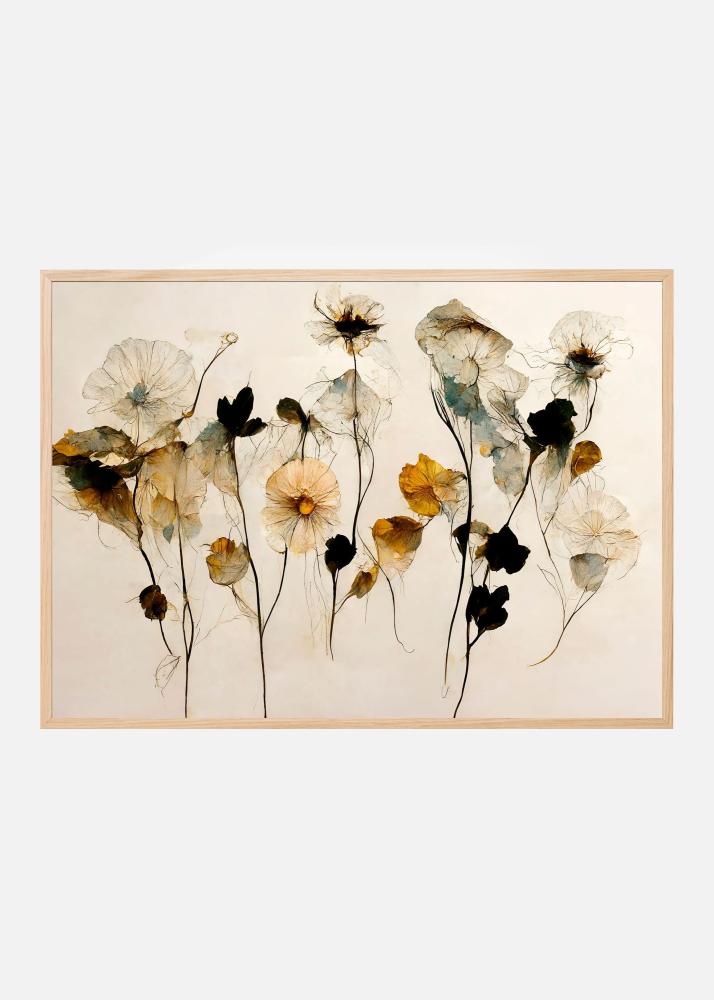 Denna eleganta poster har ett harmoniskt blommotiv som fångar essensen av naturens skönhet. Blommorna är skapade med en stiliserad design, där de mörka stjälkarna sträcker sig uppåt och skapar en känsla av rörelse och liv. Prints av denna typ kan tillföra både värme och stil till ditt hem.
