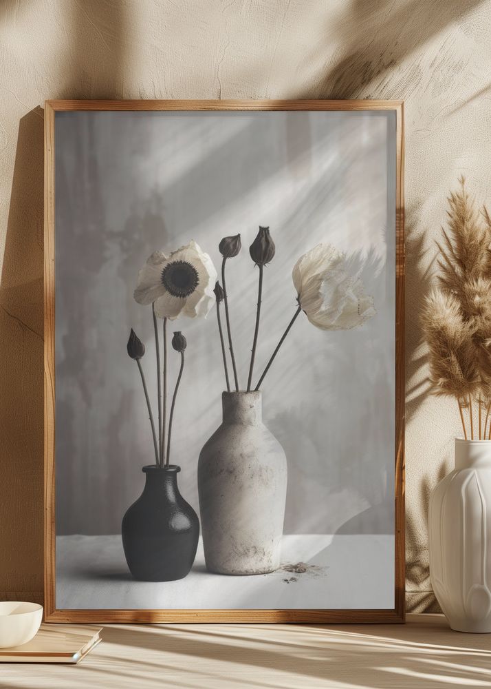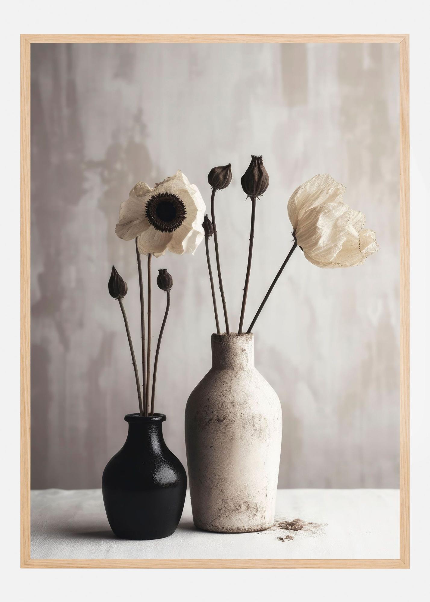 Detta eleganta motiv visar två vaser med stilfulla blommor som skapar en känsla av lugn och harmoni. Den högra vasen är vit med en subtil marmorerad yta, medan den vänstra är mörk och kontrasterar vackert mot den ljusa bakgrunden. Blommorna i affischen har torkade kronblad i mjuka vita och beige nyanser, vilket förstärker den jordnära och minimalistiska estetiken.