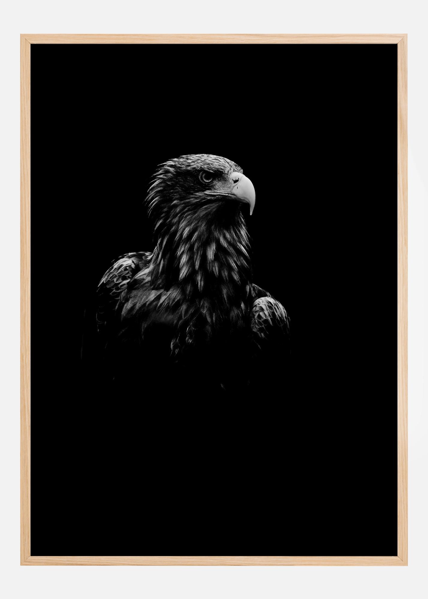 Denna dramatiska poster presenterar en mäktig örn, vars stolta profil och intensiva blick fångas mot en mörk bakgrund. Den kraftfulla avbildningen av örnen i hög kontrast ger en känsla av styrka och obändig frihet. Det är en tidlös bild som talar till oss om värdighet och majestät som naturens rovdjur besitter.