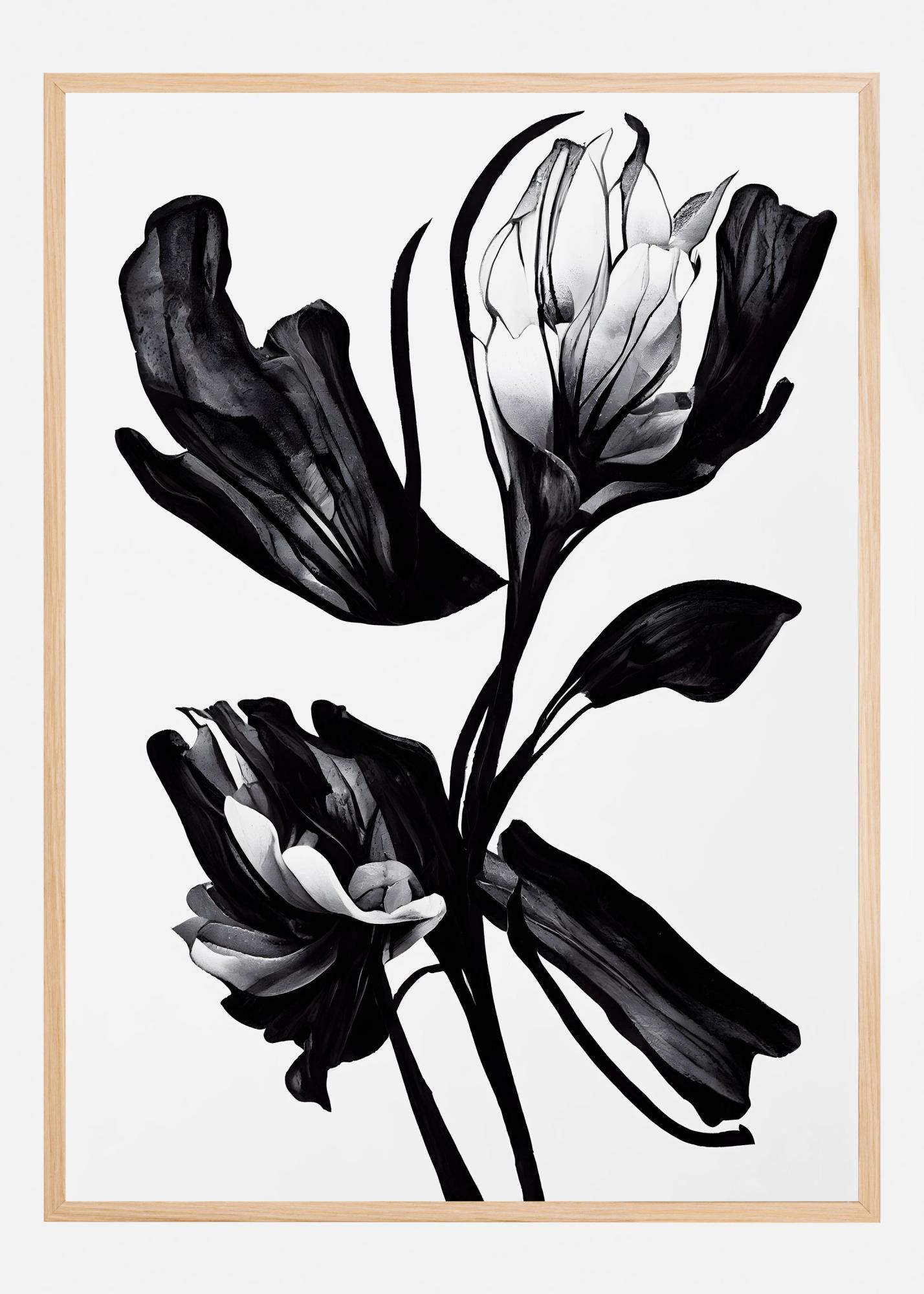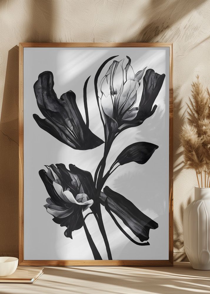 Denna eleganta poster är en perfekt tillskott för den som älskar stilfulla och moderna konstmotiv. Med sina dynamiska penseldrag av svart och vitt framhävs blommans form på ett sätt som fångar betraktarens blick. Motivet skapar en känsla av rörelse och liv, vilket gör att denna print blir en självklar fokuspunkt i varje rum.