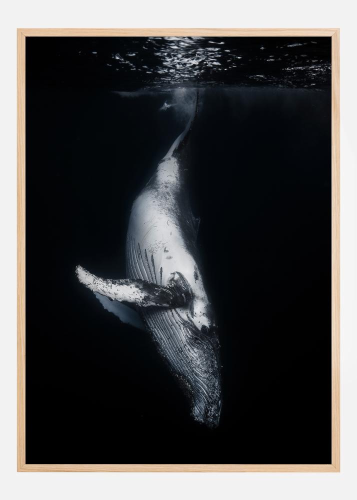 I denna avbildade poster skildras en humpbackval som graciöst glider genom mörka vatten, en bild som fångar essensen av det marina livet. Den kontrastrika svartvita kompositionen framhäver valens texturerade hud och de eleganta konturerna av dess kropp, vilket skapar en kraftfull bild av stillhet och nåd under ytan.