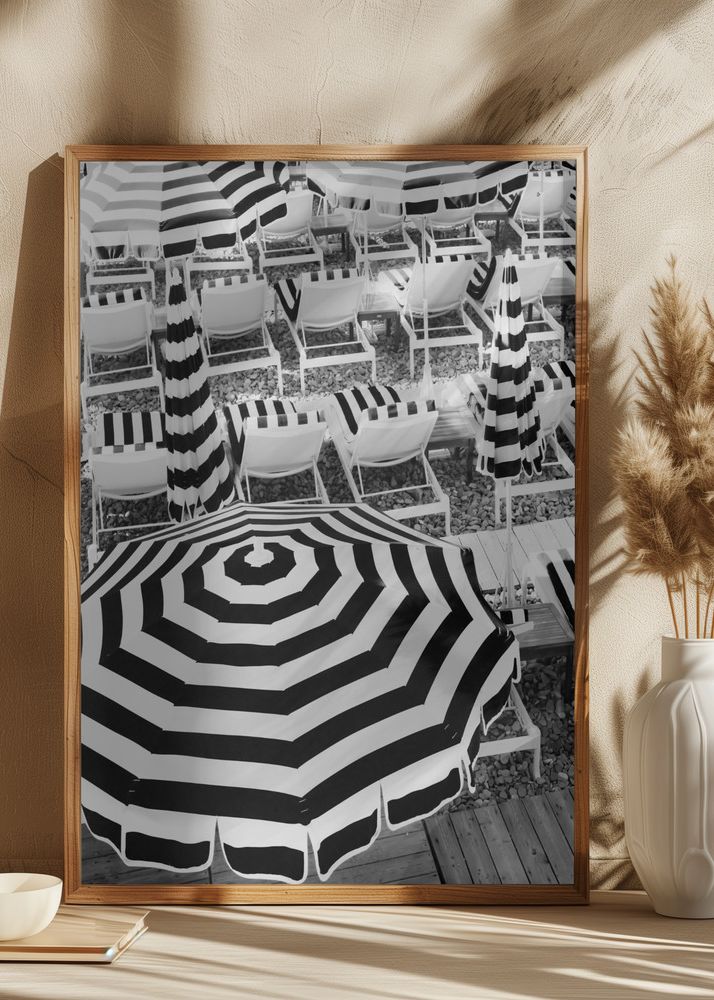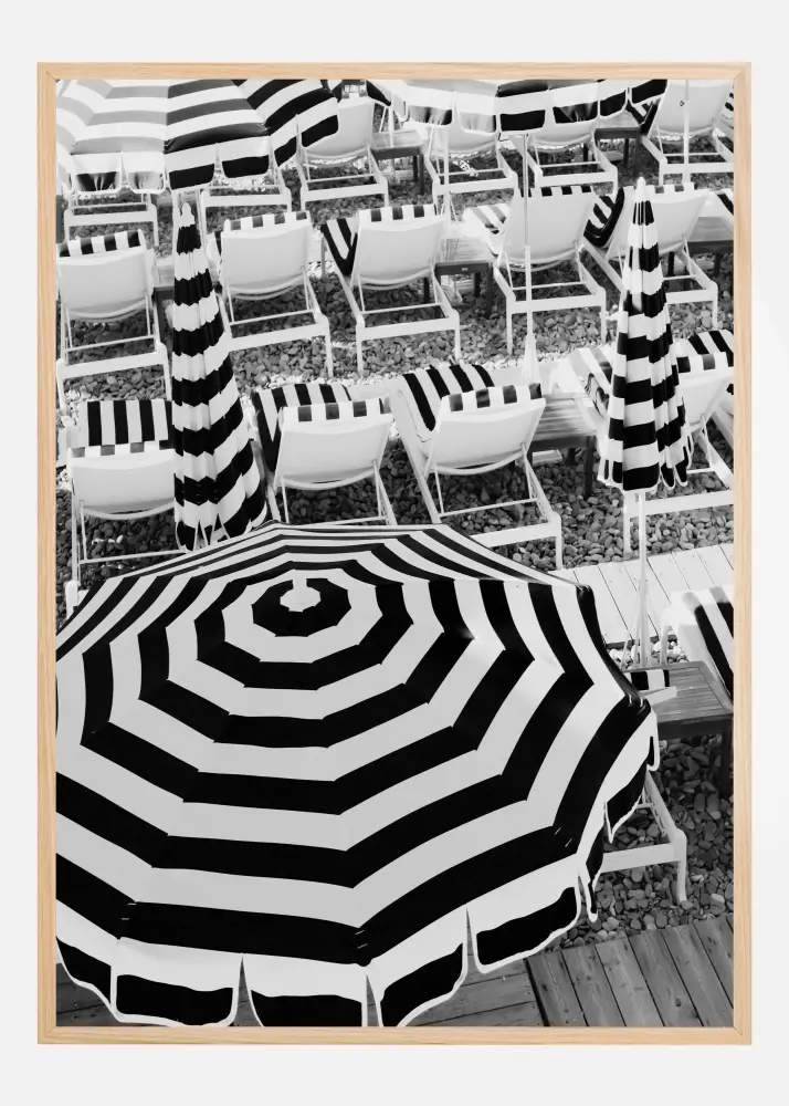 Den här stilrena posten i svartvitt fångar en strandscen med charm och elegans. Bilden består av flera randiga strandparasoller och solstolar i svart och vitt, vilka skapar ett grafiskt mönster som direkt drar till sig blicken. Parasolernas symmetriska linjer ger affischen ett tidlöst och sofistikerat uttryck, perfekt för den som vill ha en klassisk känsla med en modern twist i sitt hem.