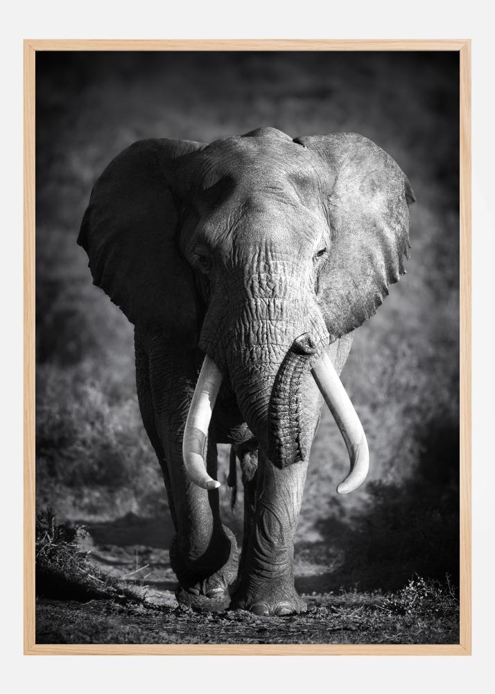 Detta svartvita print är inte bara en avbild av världens största landlevande djur, utan också en hyllning till den naturliga världens storslagenhet. Kontrasten mellan elefantens dramatiska texturer och den mjuka bakgrunden gör att denna affisch enkelt blir ett blickfång i vilket rum som helst, samtidigt som det är en subtil påminnelse om vår planets fascinerande vilda liv.