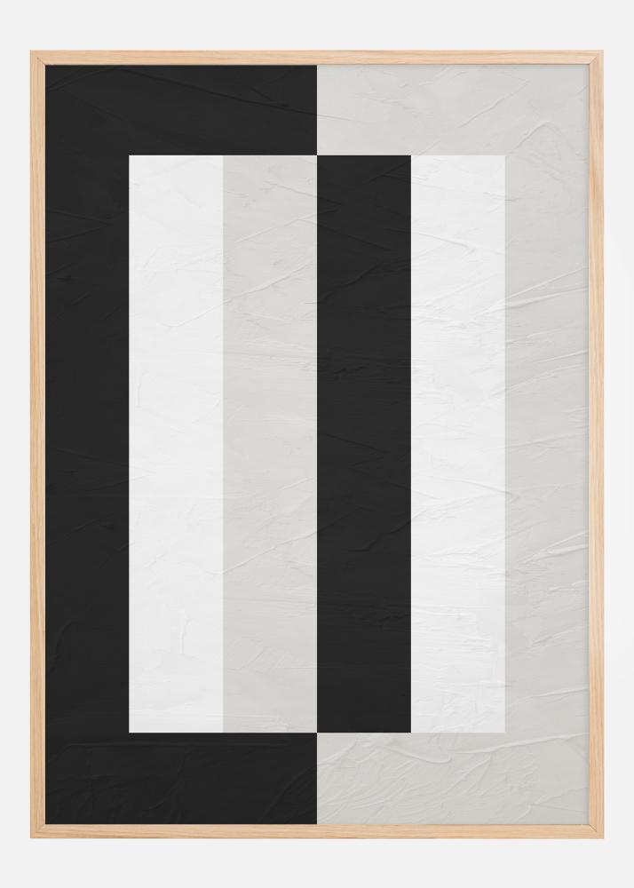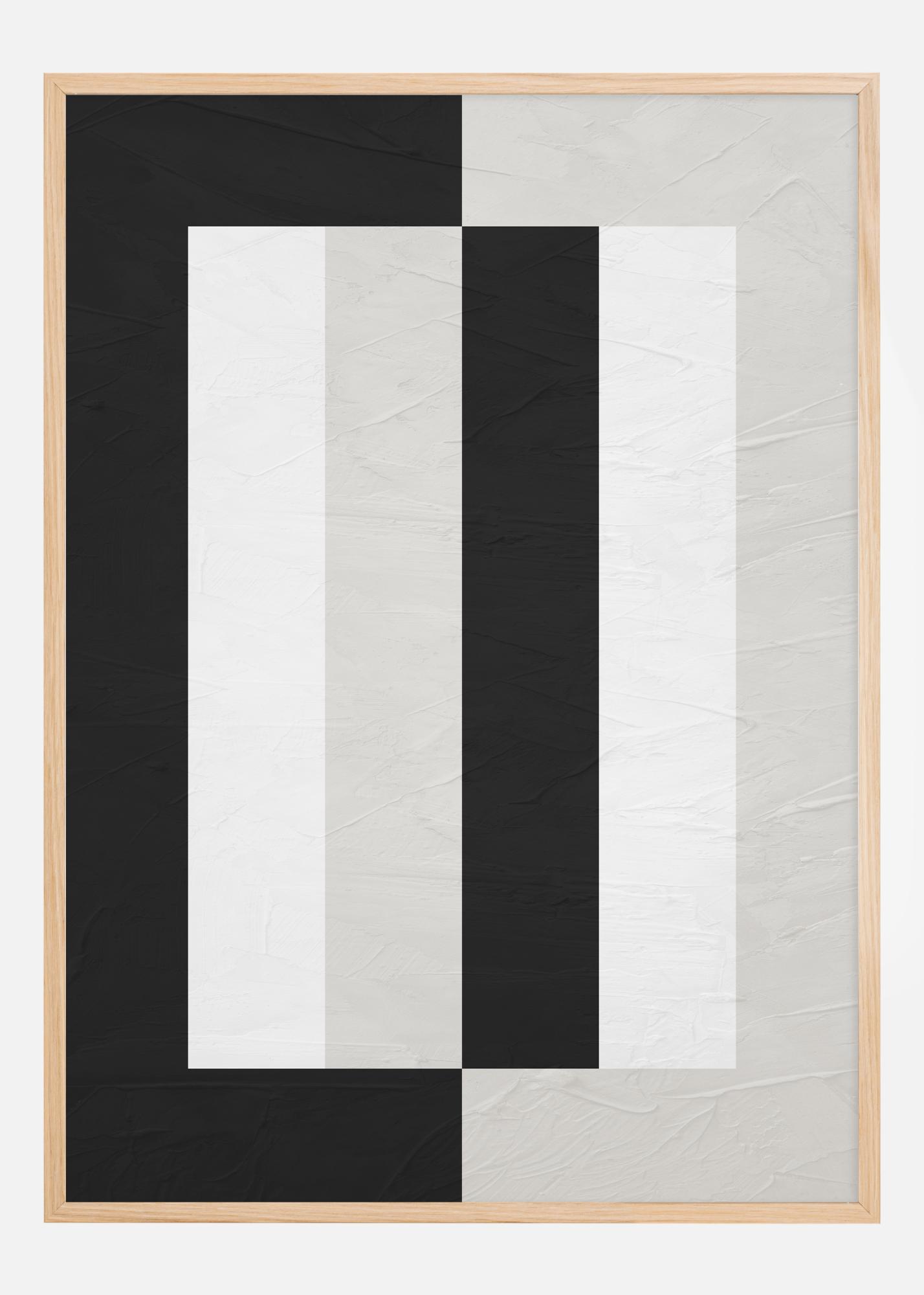 Denna sofistikerade poster presenterar en djärv och grafisk komposition som direkt fångar betraktarens uppmärksamhet. Den kontrasterande kombinationen av svart och vitt bildar en serie vertikala linjer och block, vilket skapar en optisk illusion av djup och rörelse. Denne affisch är idealisk för den moderna inredaren som söker efter ett uttalande konstverk som förmedlar en känsla av elegans och samtida design. Den strama färgpaletten gör det enkelt att integrera denna bild i olika rum och miljöer.