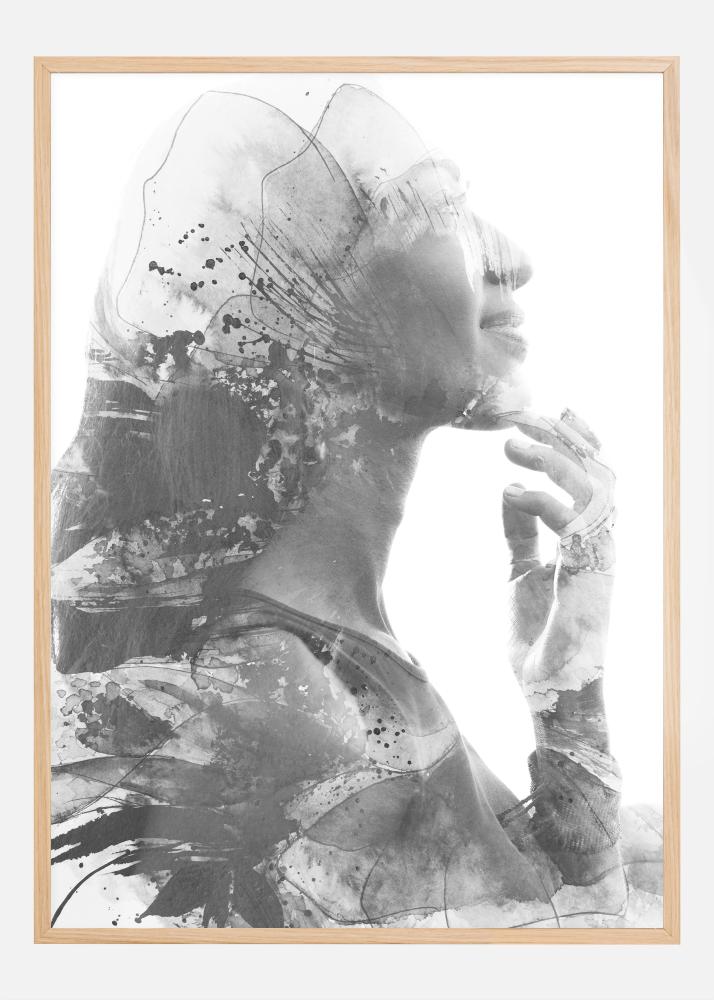 Denna konstnärliga poster visar en dubbelexponeringsbild av en kvinna i profil, vars form smälter samman med abstrakta bläckstänk och akvarellmönster i en svartvit palett. Bilden är en fängslande fusion av människa och konst, som fångar skönheten i kvinnlig eftertanke och kreativitetens flyktiga natur. Detta konstverk skulle vara ett djärvt och tankeväckande tillskott i varje modern inredning.