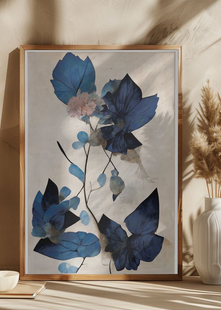 Den subtile rosa blomman tillför en extra dimension och framhäver den blå färgpaletten ytterligare. Med inslag av både svarta och grå toner i de blå bladen får printet en djup och kontrast som gör det unikt. Denna affisch är idealisk för att skapa ett lugnt och harmoniskt utrymme och passar utmärkt i ett vardagsrum eller sovrum.