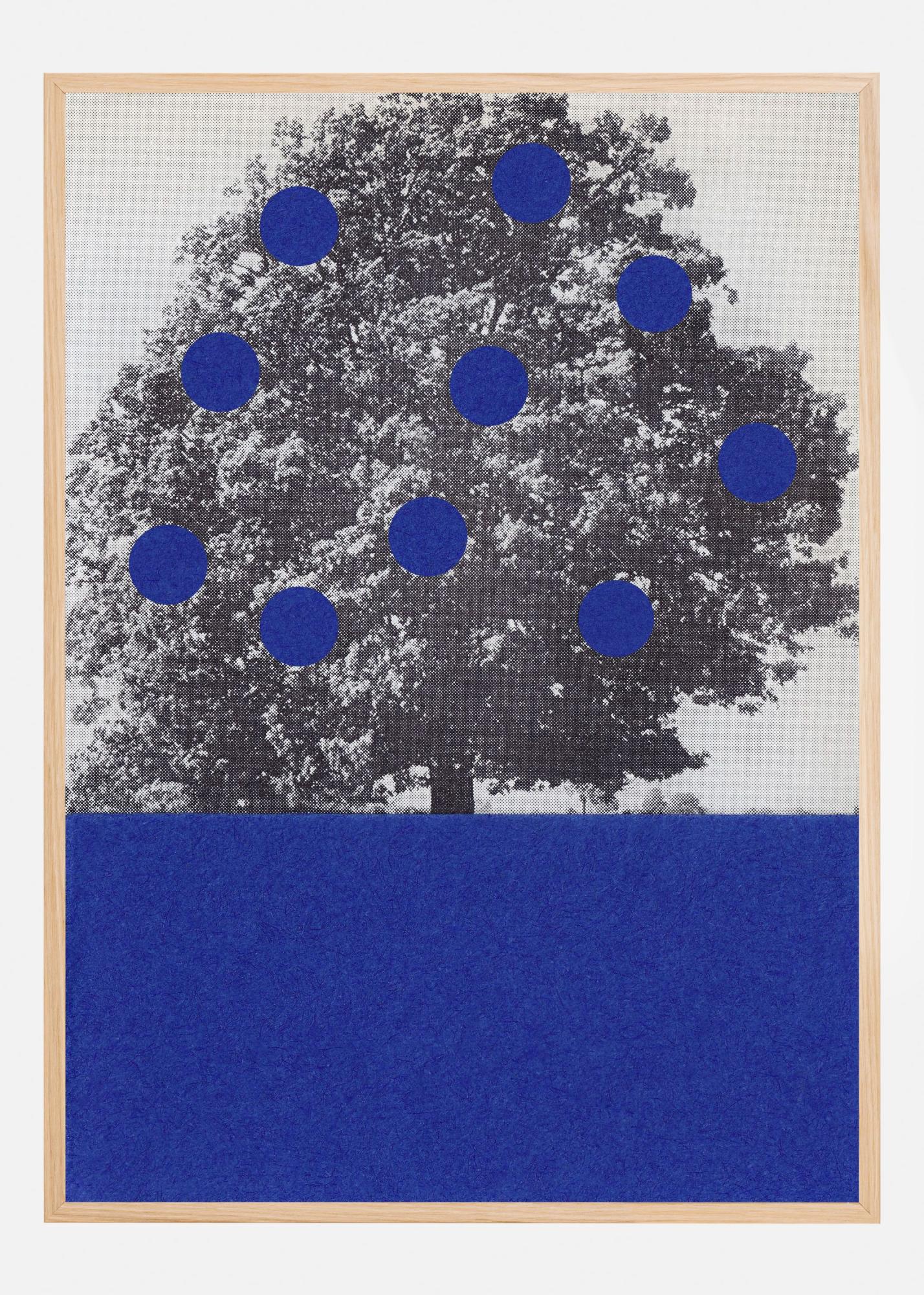Denna unika poster fångar uppmärksamheten med sitt moderna motiv där en detaljrik silhuett av ett träd står i centrum. Trädets svartvita nyans balanseras stilfullt av de djärvt blå cirklarna som flyter över den, vilket tillför ett geometriskt och samtida uttryck. Den nedre delen av printet är fylld med en intensiv blå färg som ger en stark kontrast till trädets subtila grå toner.