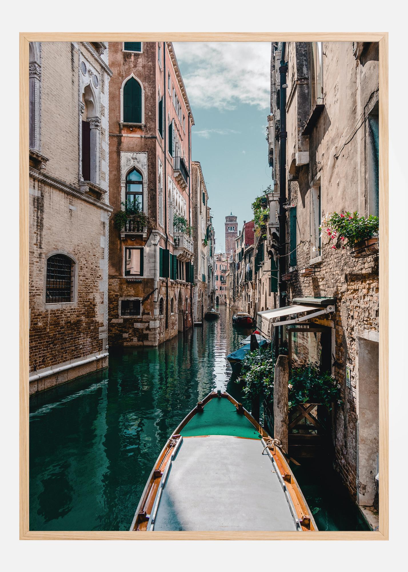 Denna fängslande poster fångar essensen av en pittoresk kanal i Venedig, komplett med traditionell gondol i förgrunden. Ljuset faller vackert över de färgstarka fasaderna av de omgivande byggnaderna, och reflektionerna i det stilla vattnet skapar en spegling som är både klar och förtrollande. Nyanser av jordiga röda och orangefärgade toner i byggnadernas murverk kontrasteras med den lugna akvatiska blågröna färgen på kanalen.