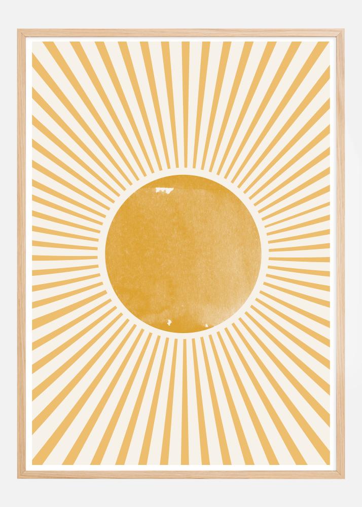 Denna livfulla poster framkallar känslan av en strålande sol med sina utstrålade linjer i guldtoner som omger en central gul cirkel på en mjuk vit bakgrund. Designen är inspirerad av bohemiska och geometriska mönster, som tillsammans skapar en bild av solens värme och energi. De varma färgerna och det strålande mönstret är utformade för att ge en känsla av glädje och positivitet.