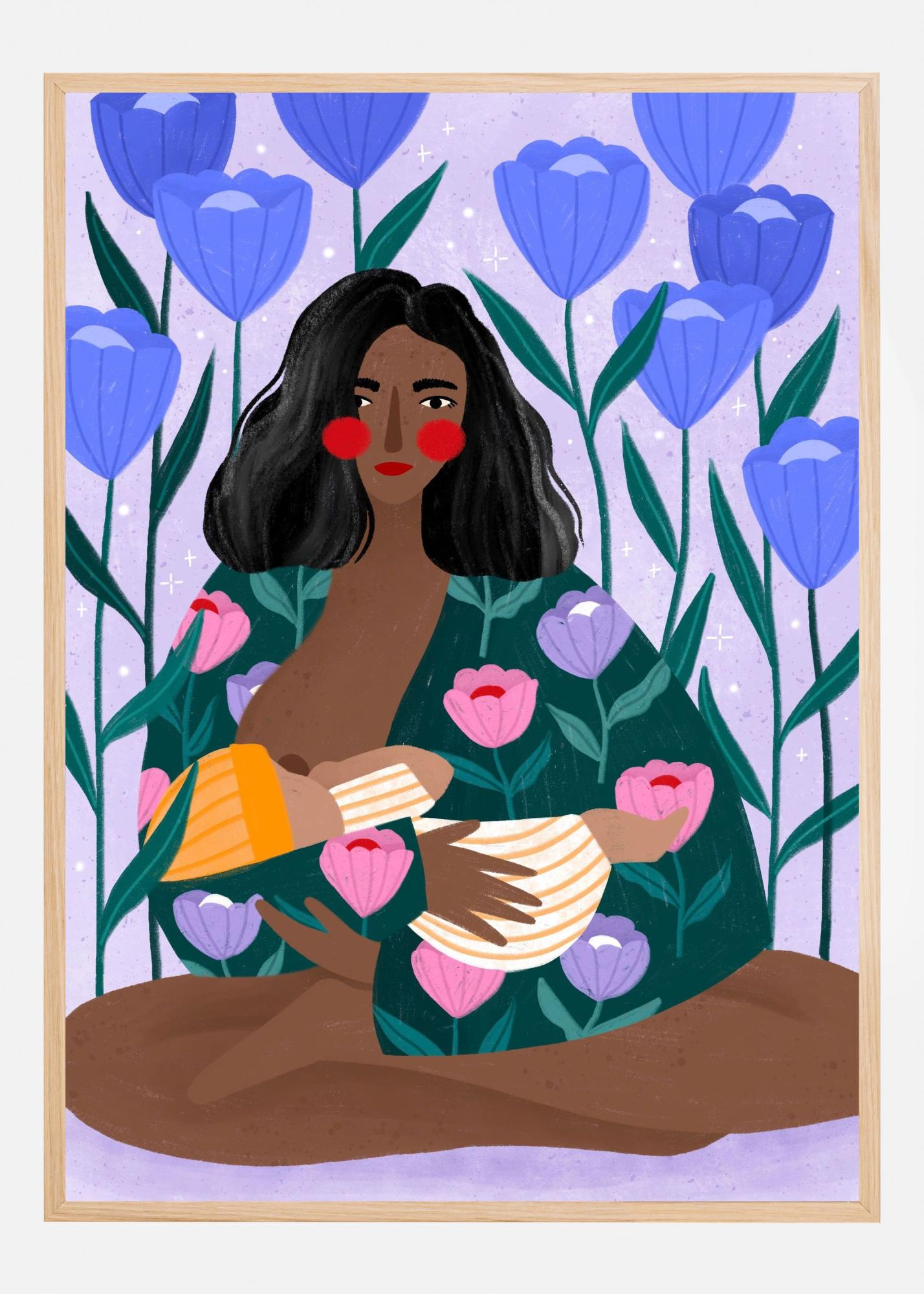 Denna livfulla poster fångar ett ögonblick av moderlig ömhet, där en mamma ammar sitt barn i en sagolik miljö. Omgiven av stora, vackra blommor i varierande nyanser av lila och rosa, utstrålar bilden lugn och kärlek. De kontrasterade färgerna på mamman och barnets kläder, i gröna och orangea toner, ger en varm och inbjudande känsla. Perfekt som ett print för den som vill sprida en känsla av harmoni och skönhet i sitt hem.